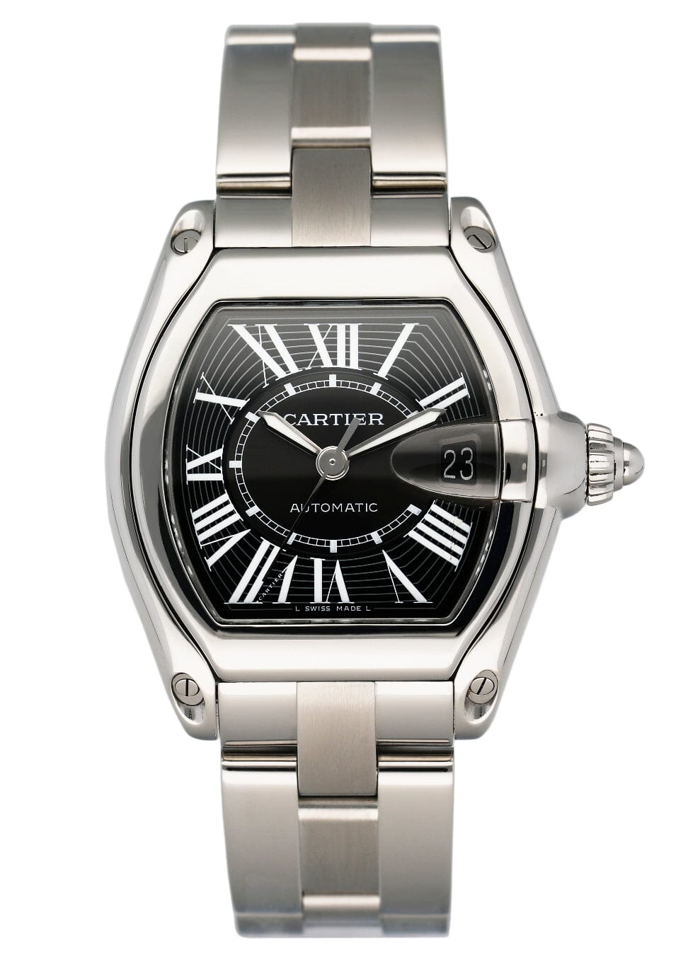 This Cartier Roadster W62041V3 has a black roman numeral dial and a bracelet strap. This Cartier has undergone a thorough inspection of accuracy, functionality and condition at our Cartier certified service centre to determine the level of reconditioning required to meet our strict standards. It has also been checked against our records to ensure authenticity. Our watches have a 24-month warranty for your peace of mind, in conjunction with any remaining manufacturer’s warranty from new or from service.