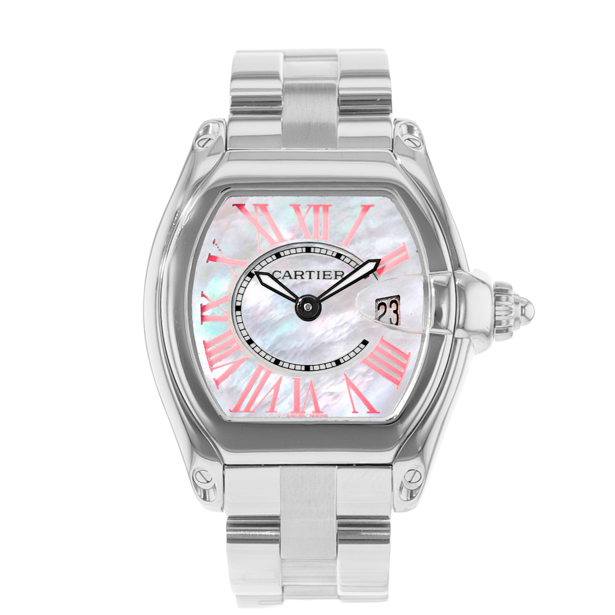 This Cartier Roadster W6206006 has a mother of pearl white roman numeral dial and a bracelet strap. This Cartier has undergone a thorough inspection of accuracy, functionality and condition at our Cartier certified service centre to determine the level of reconditioning required to meet our strict standards. It has also been checked against our records to ensure authenticity. All our watches have a 24-month warranty for your peace of mind.