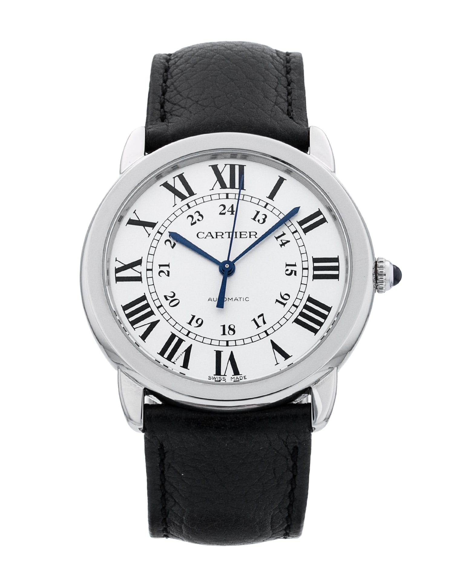 This Cartier Ronde Solo WSRN0021 has a silver roman numeral dial and a leather strap. This Cartier has undergone a thorough inspection of accuracy, functionality and condition at our Cartier certified service centre to determine the level of reconditioning required to meet our strict standards. It has also been checked against our records to ensure authenticity. All our watches have a 24-month warranty for your peace of mind.