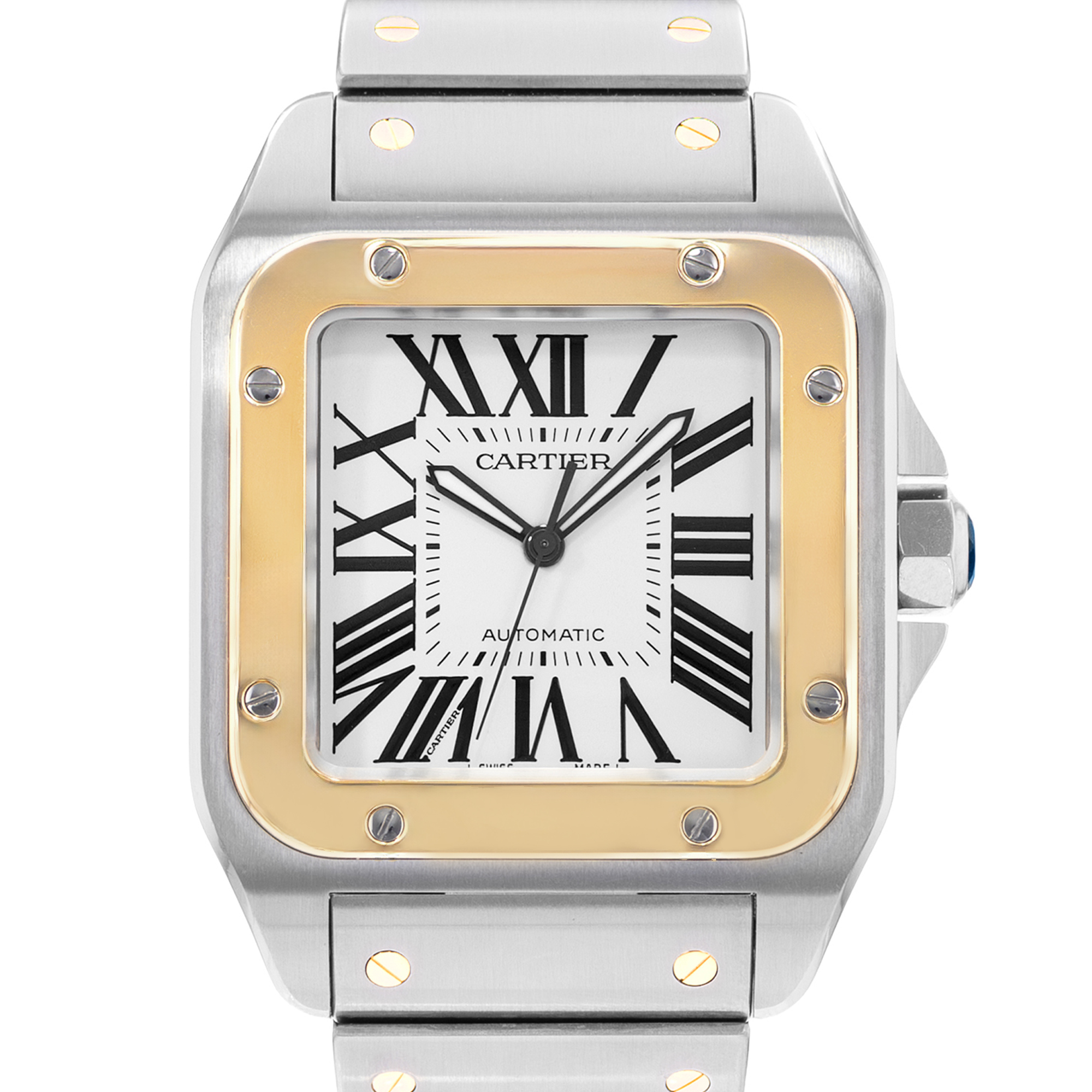 This Cartier Santos 100 W200728G has a silver roman numeral dial and a bracelet strap. This Cartier has undergone a thorough inspection of accuracy, functionality and condition at our Cartier certified service centre to determine the level of reconditioning required to meet our strict standards. It has also been checked against our records to ensure authenticity. All our watches have a 24-month warranty for your peace of mind.