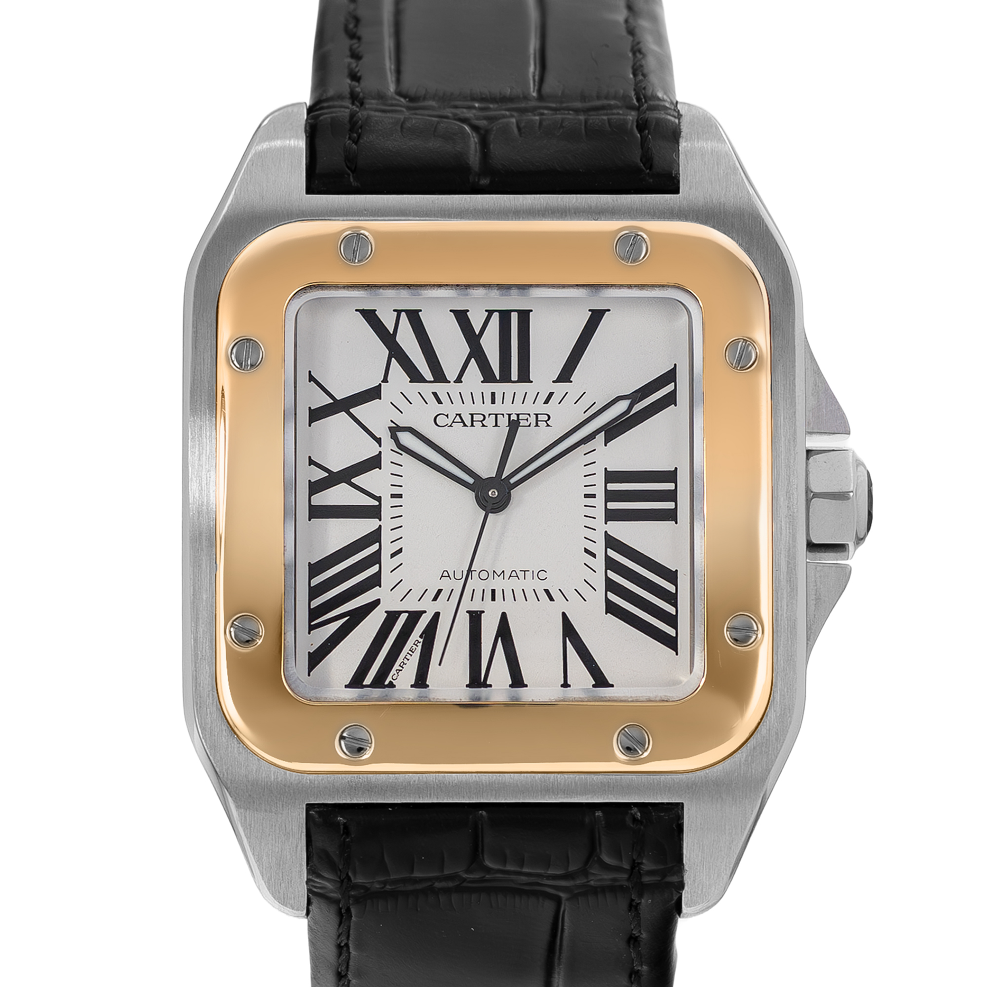 This Cartier Santos 100 W20072X7 has a silver roman numeral dial and a leather strap. This Cartier has undergone a thorough inspection of accuracy, functionality and condition at our Cartier certified service centre to determine the level of reconditioning required to meet our strict standards. It has also been checked against our records to ensure authenticity. All our watches have a 24-month warranty for your peace of mind.