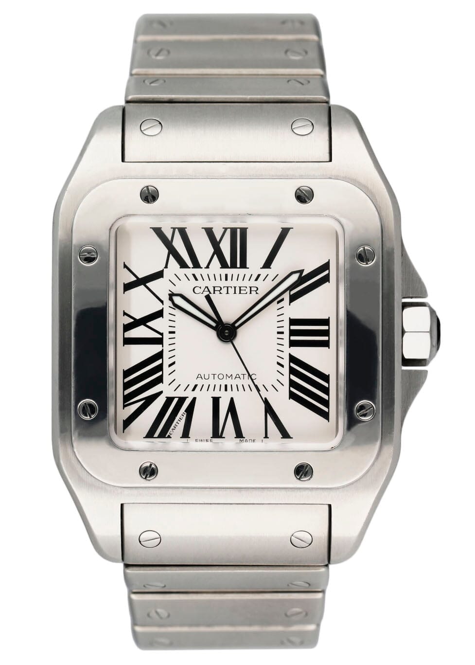 This Cartier Santos 100 W200737G has a silver roman numeral dial and a bracelet strap. This Cartier has undergone a thorough inspection of accuracy, functionality and condition at our Cartier certified service centre to determine the level of reconditioning required to meet our strict standards. It has also been checked against our records to ensure authenticity. All our watches have a 24-month warranty for your peace of mind.