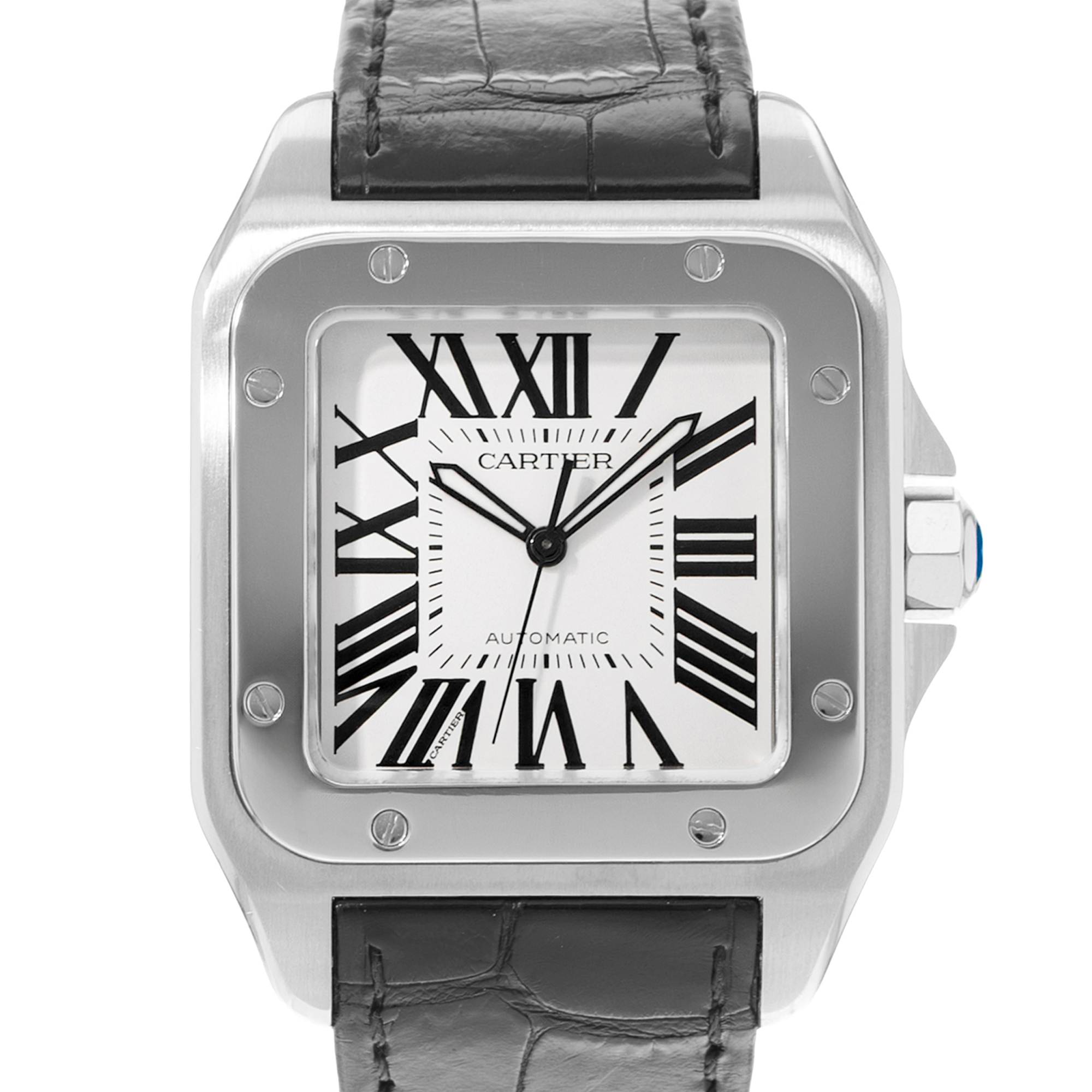 This Cartier Santos 100 W20073X8 has a silver roman numeral dial and a leather strap. This Cartier has undergone a thorough inspection of accuracy, functionality and condition at our Cartier certified service centre to determine the level of reconditioning required to meet our strict standards. It has also been checked against our records to ensure authenticity. All our watches have a 24-month warranty for your peace of mind.