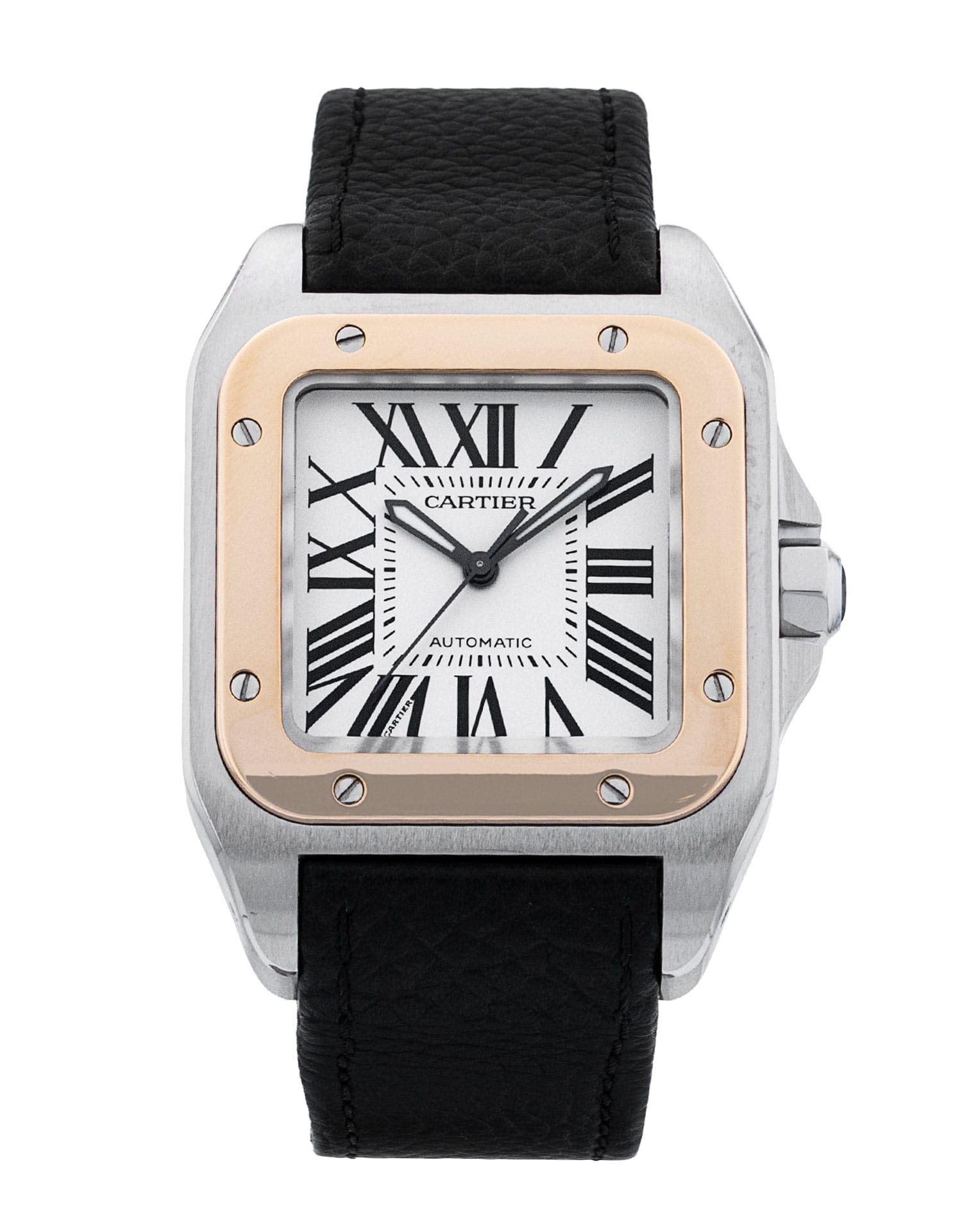 This Cartier Santos 100 W20107X7 has a silver roman numeral dial and a leather strap. This Cartier has undergone a thorough inspection of accuracy, functionality and condition at our Cartier certified service centre to determine the level of reconditioning required to meet our strict standards. It has also been checked against our records to ensure authenticity. All our watches have a 24-month warranty for your peace of mind.