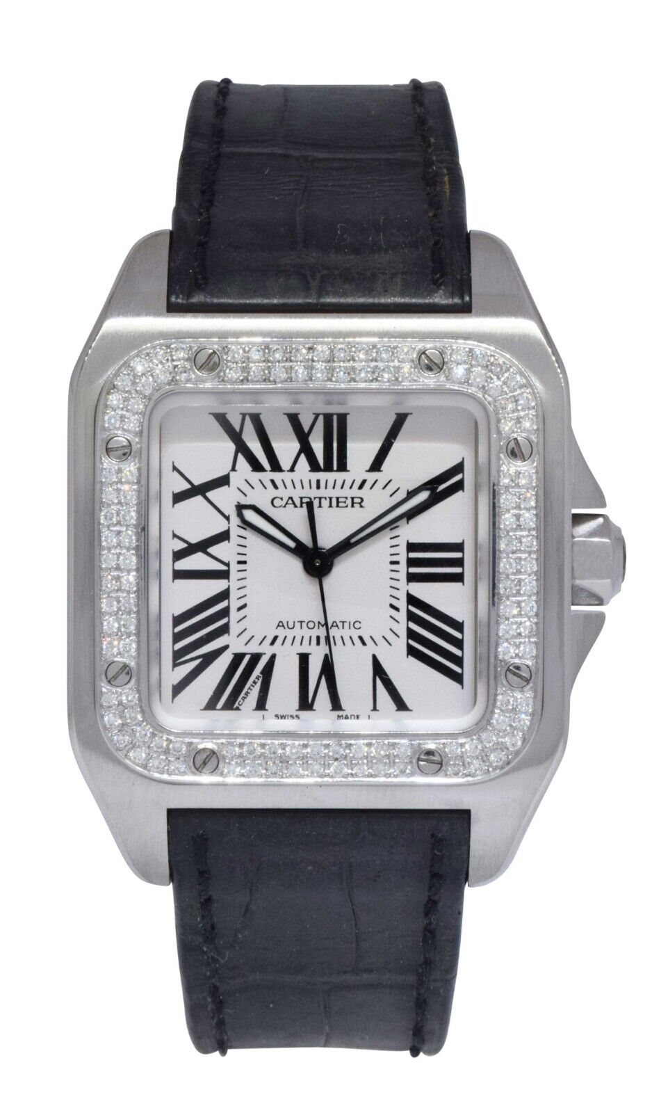This Cartier Santos 100 W20126X8 has a silver roman numeral dial and a leather strap. This Cartier has undergone a thorough inspection of accuracy, functionality and condition at our Cartier certified service centre to determine the level of reconditioning required to meet our strict standards. It has also been checked against our records to ensure authenticity. All our watches have a 24-month warranty for your peace of mind.