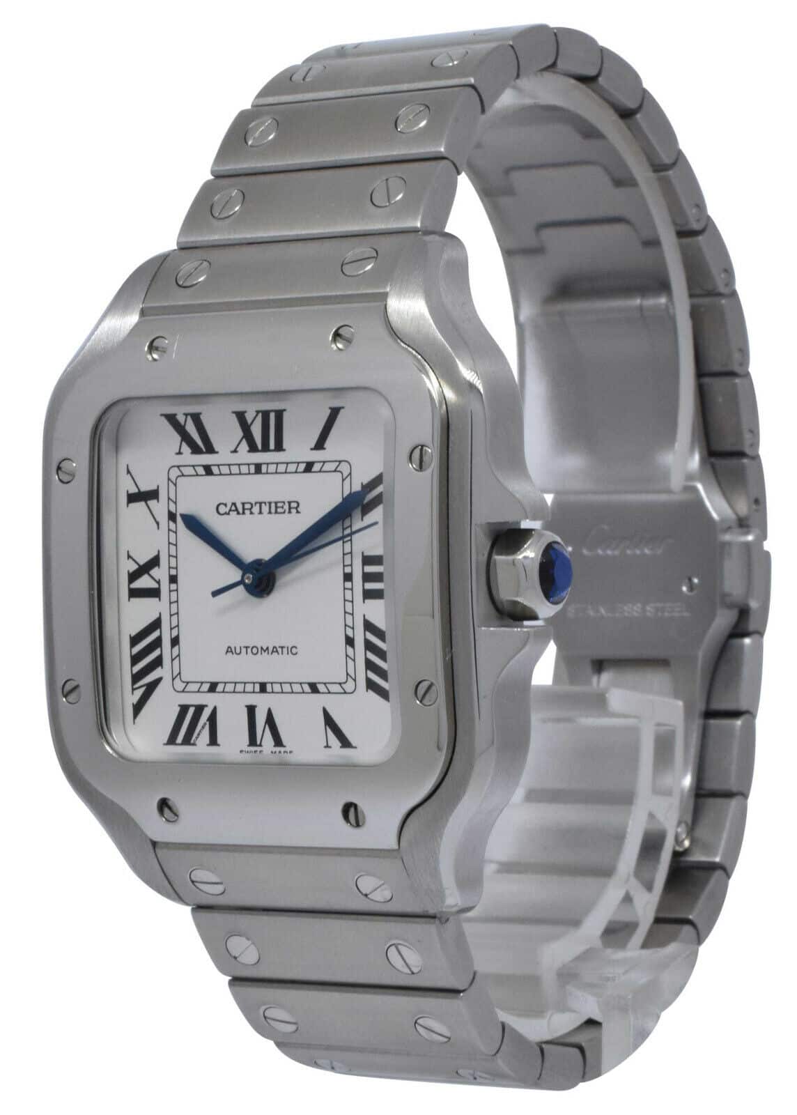 This Cartier Santos De Cartier WSSA0029 has a silver roman numeral dial and a bracelet strap. This Cartier has undergone a thorough inspection of accuracy, functionality and condition at our Cartier certified service centre to determine the level of reconditioning required to meet our strict standards. It has also been checked against our records to ensure authenticity. All our watches have a 24-month warranty for your peace of mind.