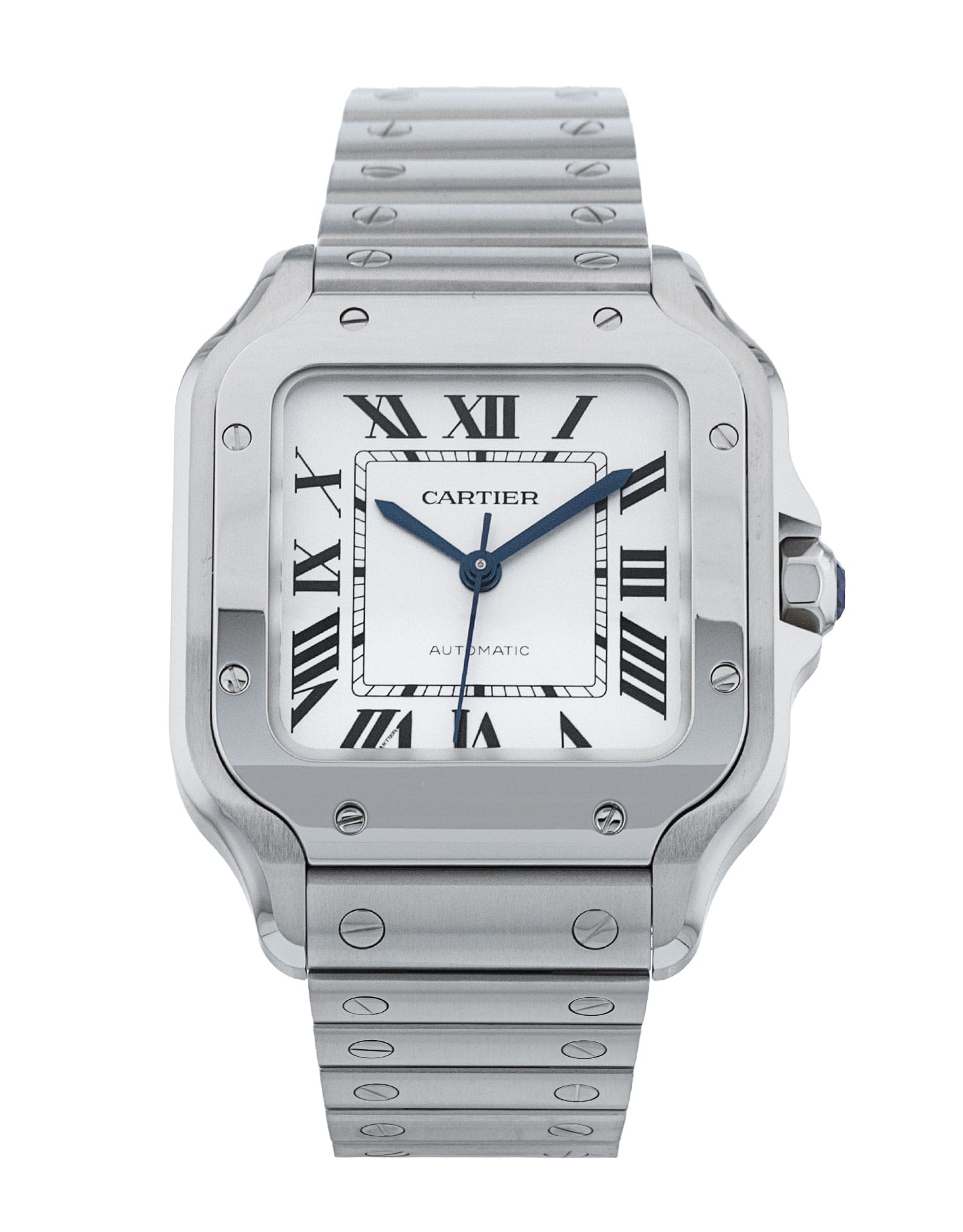 This Cartier Santos De Cartier WSSA0029 has a silver roman numeral dial and a bracelet strap. This Cartier has undergone a thorough inspection of accuracy, functionality and condition at our Cartier certified service centre to determine the level of reconditioning required to meet our strict standards. It has also been checked against our records to ensure authenticity. Our watches have a 24-month warranty for your peace of mind, in conjunction with any remaining manufacturer’s warranty from new or from service.