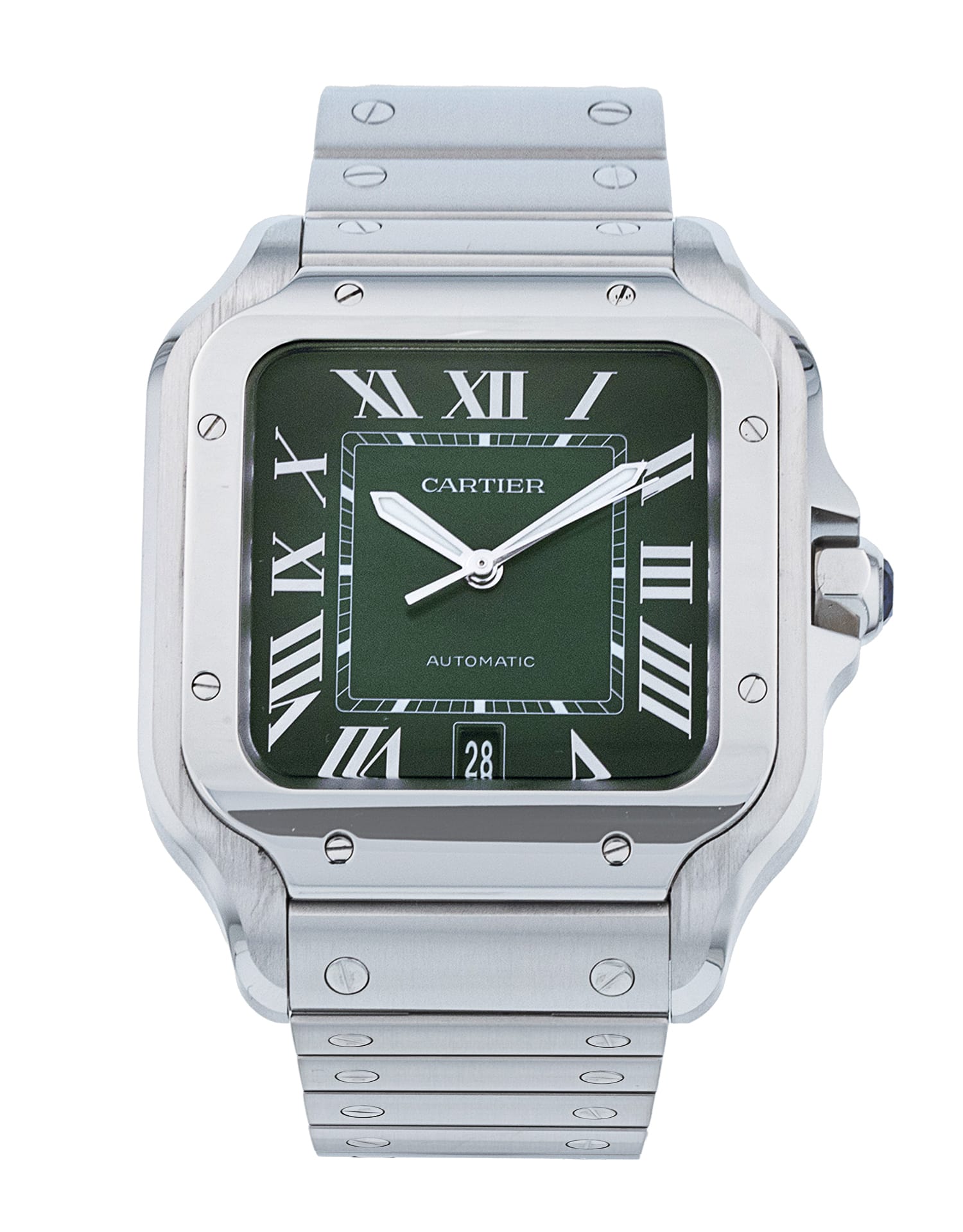 This Cartier Santos De Cartier WSSA0062 has a green roman numeral dial and a bracelet strap. This Cartier has undergone a thorough inspection of accuracy, functionality and condition at our Cartier certified service centre to determine the level of reconditioning required to meet our strict standards. It has also been checked against our records to ensure authenticity. Our watches have a 24-month warranty for your peace of mind, in conjunction with any remaining manufacturer’s warranty from new or from service.