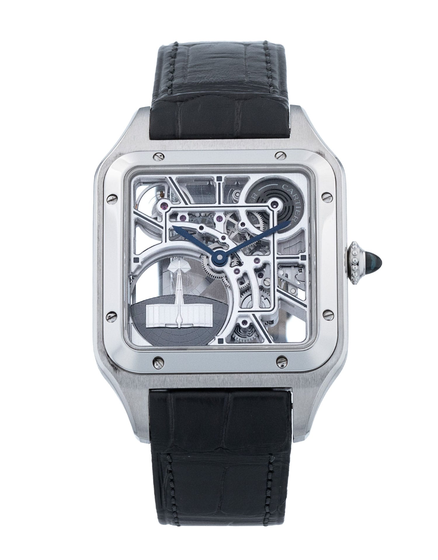 This Cartier Santos Dumont WHSA0032 has a skeleton dial and a leather strap. This Cartier has undergone a thorough inspection of accuracy, functionality and condition at our Cartier certified service centre to determine the level of reconditioning required to meet our strict standards. It has also been checked against our records to ensure authenticity. Our watches have a 24-month warranty for your peace of mind, in conjunction with any remaining manufacturer’s warranty from new or from service.