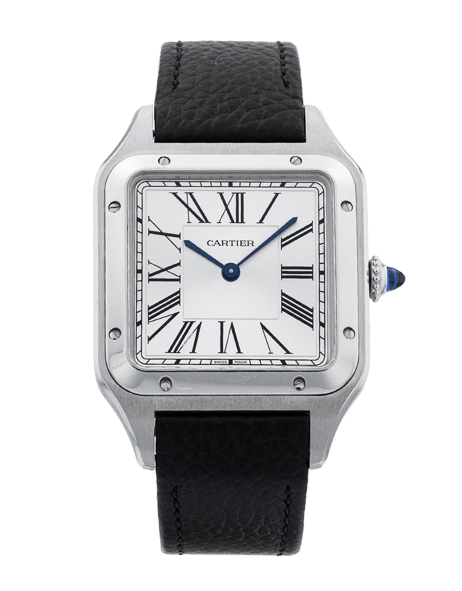 This Cartier Santos Dumont WSSA0022 has a silver roman numeral dial and a leather strap. This Cartier has undergone a thorough inspection of accuracy, functionality and condition at our Cartier certified service centre to determine the level of reconditioning required to meet our strict standards. It has also been checked against our records to ensure authenticity. All our watches have a 24-month warranty for your peace of mind.