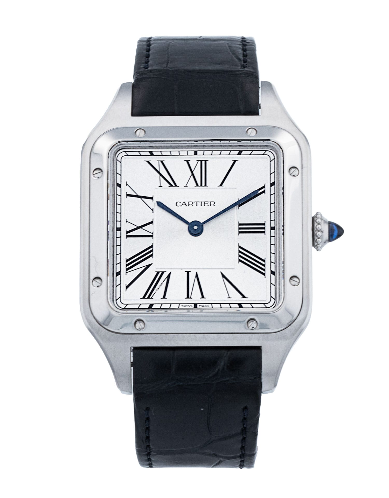 This Cartier Santos Dumont WSSA0022 has a silver roman numeral dial and a leather strap. This Cartier has undergone a thorough inspection of accuracy, functionality and condition at our Cartier certified service centre to determine the level of reconditioning required to meet our strict standards. It has also been checked against our records to ensure authenticity. Our watches have a 24-month warranty for your peace of mind, in conjunction with any remaining manufacturer’s warranty from new or from service.