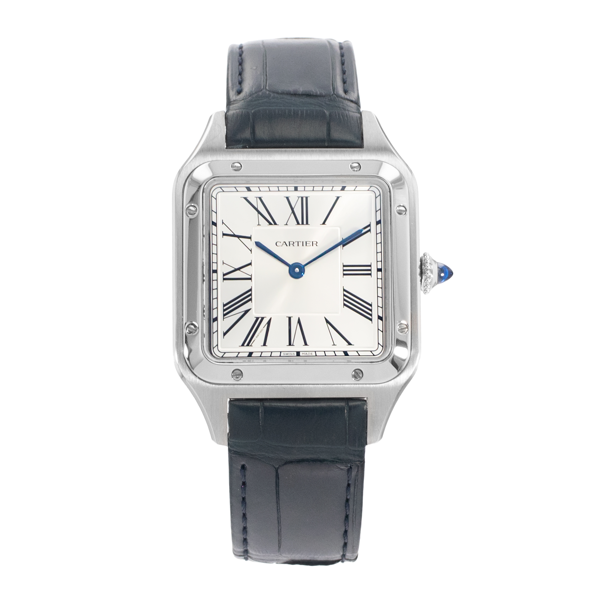 This Cartier Santos Dumont WSSA0022 has a silver roman numeral dial and a leather strap. This Cartier has undergone a thorough inspection of accuracy, functionality and condition at our Cartier certified service centre to determine the level of reconditioning required to meet our strict standards. It has also been checked against our records to ensure authenticity. All our watches have a 24-month warranty for your peace of mind.