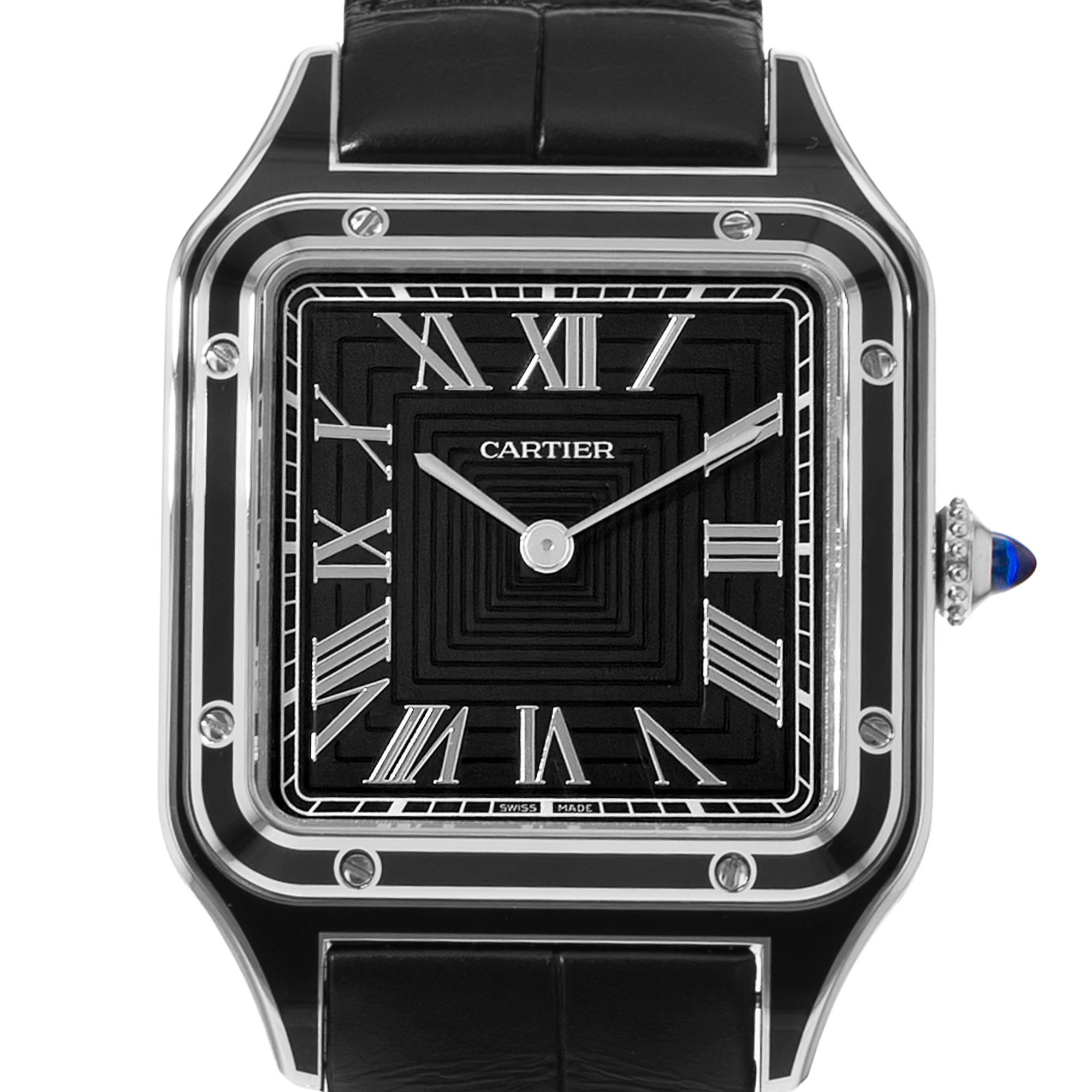This Cartier Santos Dumont WSSA0046 has a black roman numeral dial and a leather strap. This Cartier has undergone a thorough inspection of accuracy, functionality and condition at our Cartier certified service centre to determine the level of reconditioning required to meet our strict standards. It has also been checked against our records to ensure authenticity. All our watches have a 24-month warranty for your peace of mind.