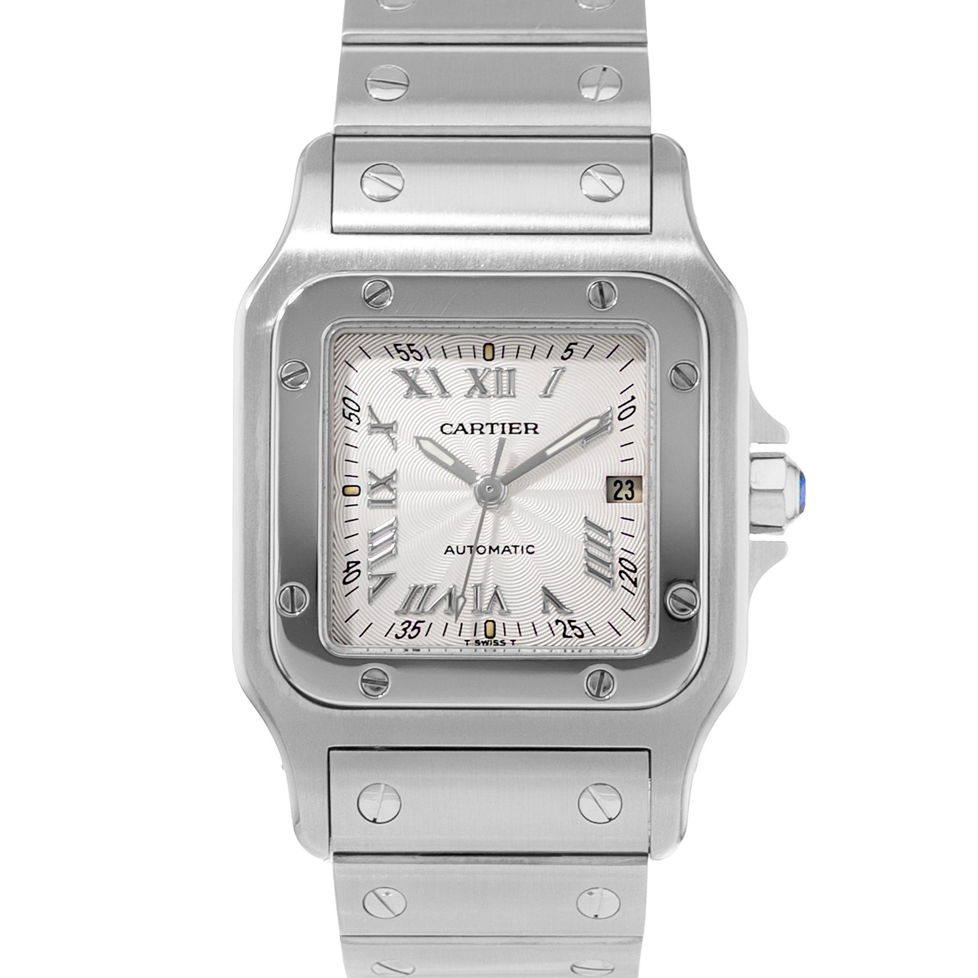 This Cartier Santos Galbee W20040D6 has a silver roman numeral dial and a bracelet strap. This Cartier has undergone a thorough inspection of accuracy, functionality and condition at our Cartier certified service centre to determine the level of reconditioning required to meet our strict standards. It has also been checked against our records to ensure authenticity. All our watches have a 24-month warranty for your peace of mind.