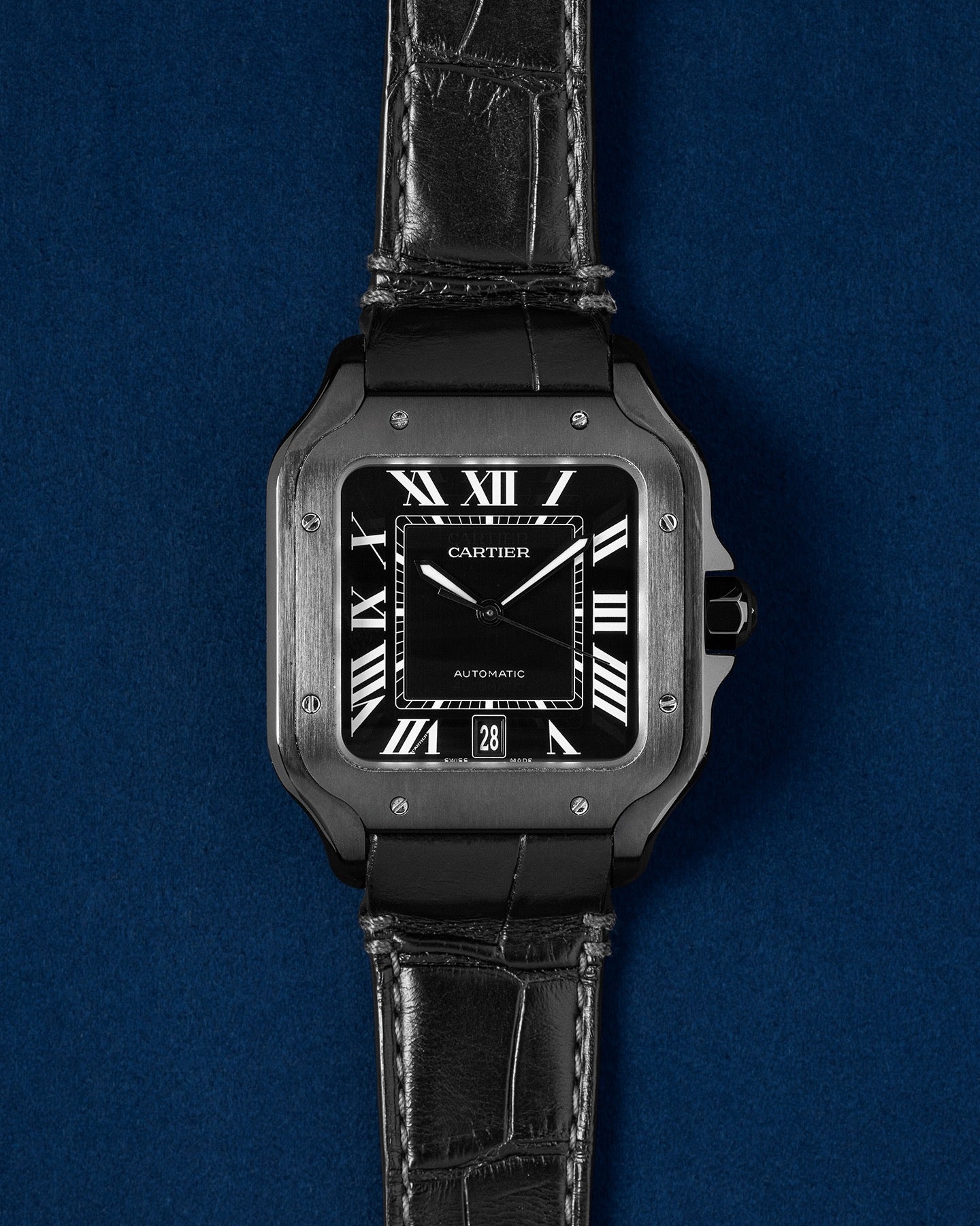 This Cartier Santos WSSA0039 has a black roman numeral dial and a leather strap. This Cartier has undergone a thorough inspection of accuracy, functionality and condition at our Cartier certified service centre to determine the level of reconditioning required to meet our strict standards. It has also been checked against our records to ensure authenticity. All our watches have a 24-month warranty for your peace of mind.
