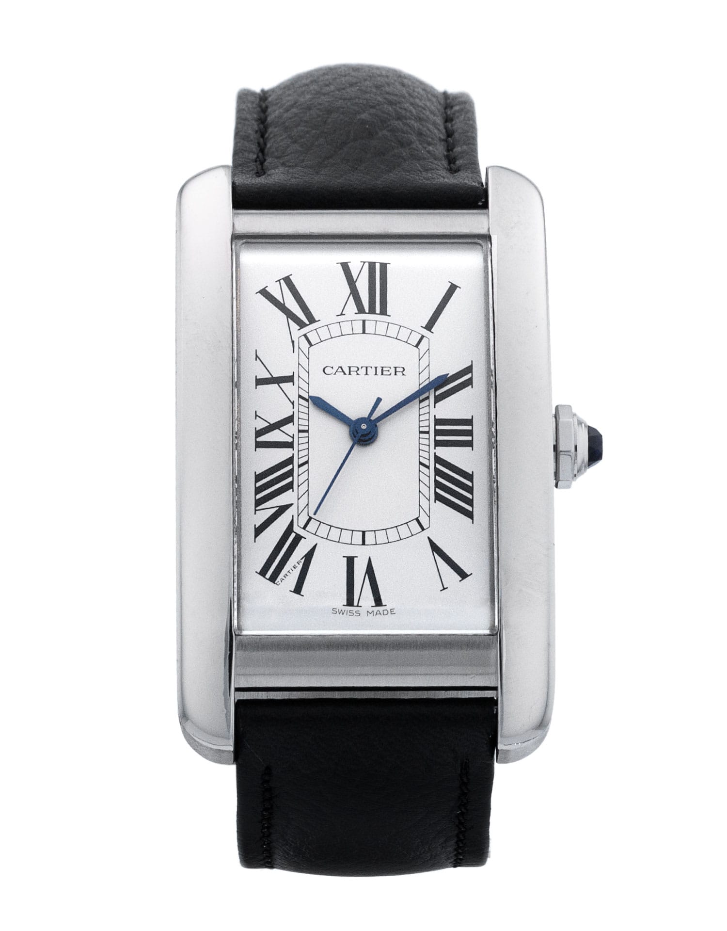 This Cartier Tank Americaine WSTA0018 has a silver roman numeral dial and a leather strap. This Cartier has undergone a thorough inspection of accuracy, functionality and condition at our Cartier certified service centre to determine the level of reconditioning required to meet our strict standards. It has also been checked against our records to ensure authenticity. All our watches have a 24-month warranty for your peace of mind.