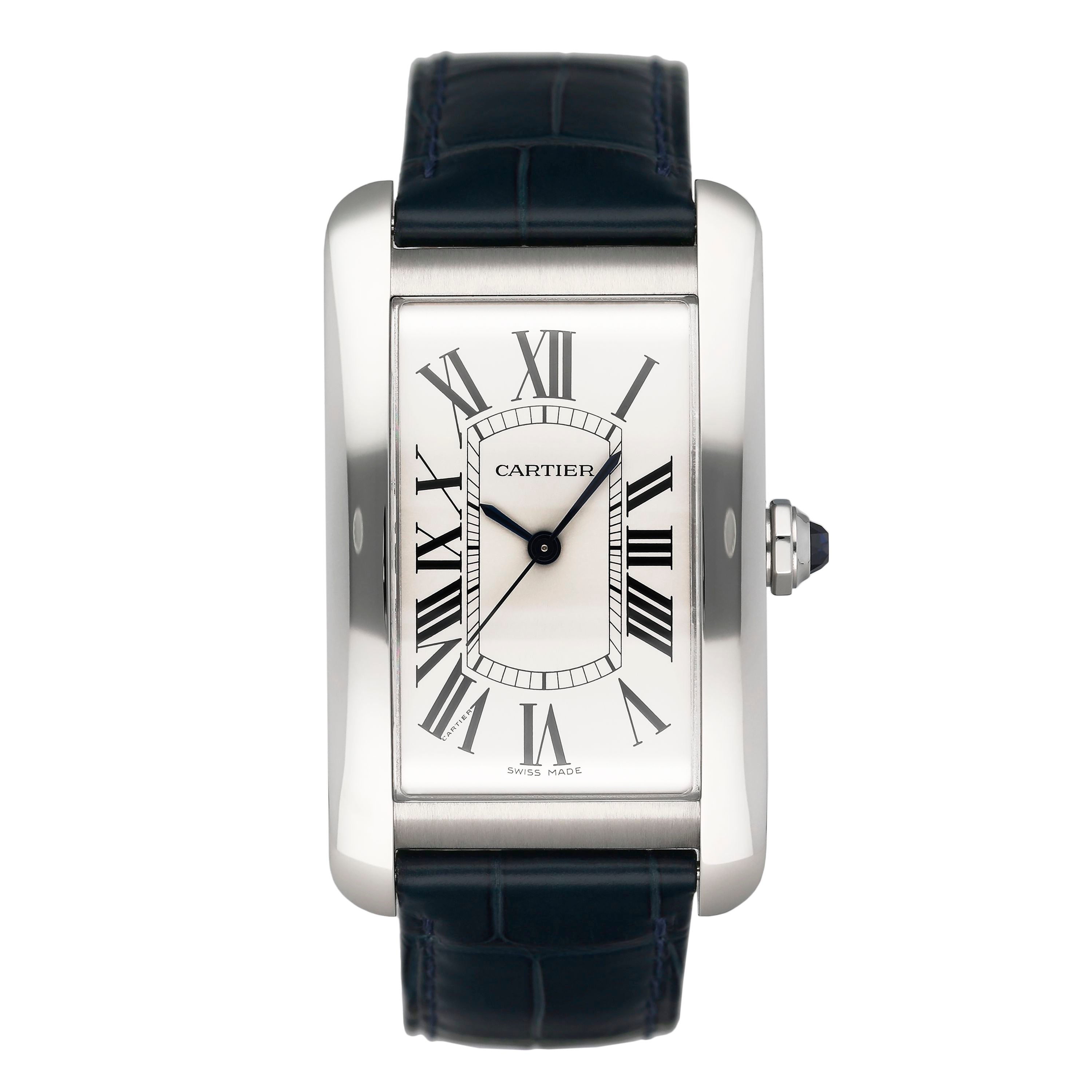 This Cartier Tank Americaine WSTA0045 has a silver roman numeral dial and a leather strap. This Cartier has undergone a thorough inspection of accuracy, functionality and condition at our Cartier certified service centre to determine the level of reconditioning required to meet our strict standards. It has also been checked against our records to ensure authenticity. All our watches have a 24-month warranty for your peace of mind.