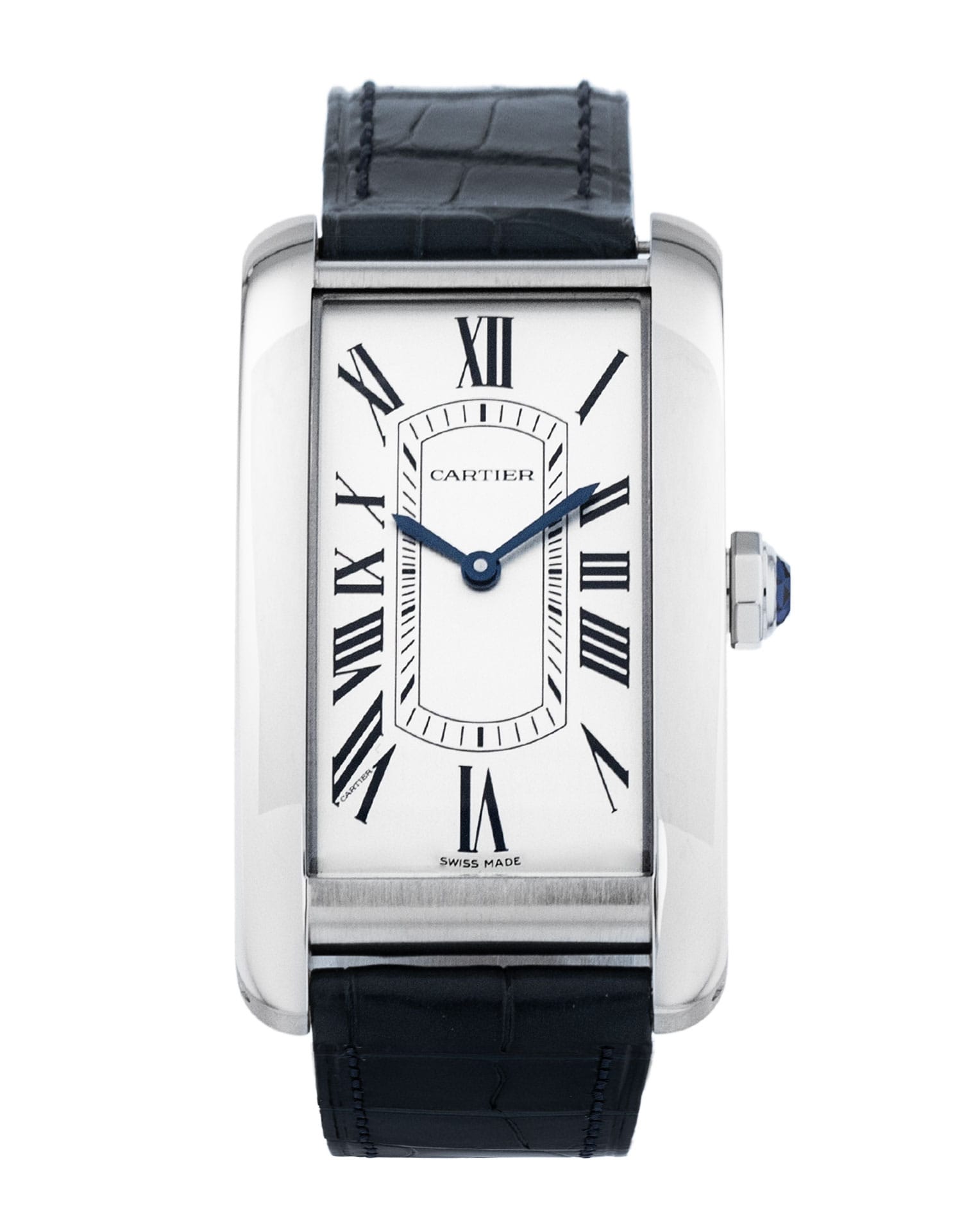 This Cartier Tank Americaine WSTA0083 has a silver roman numeral dial and a leather strap. This Cartier has undergone a thorough inspection of accuracy, functionality and condition at our Cartier certified service centre to determine the level of reconditioning required to meet our strict standards. It has also been checked against our records to ensure authenticity. Our watches have a 24-month warranty for your peace of mind, in conjunction with any remaining manufacturer’s warranty from new or from service.