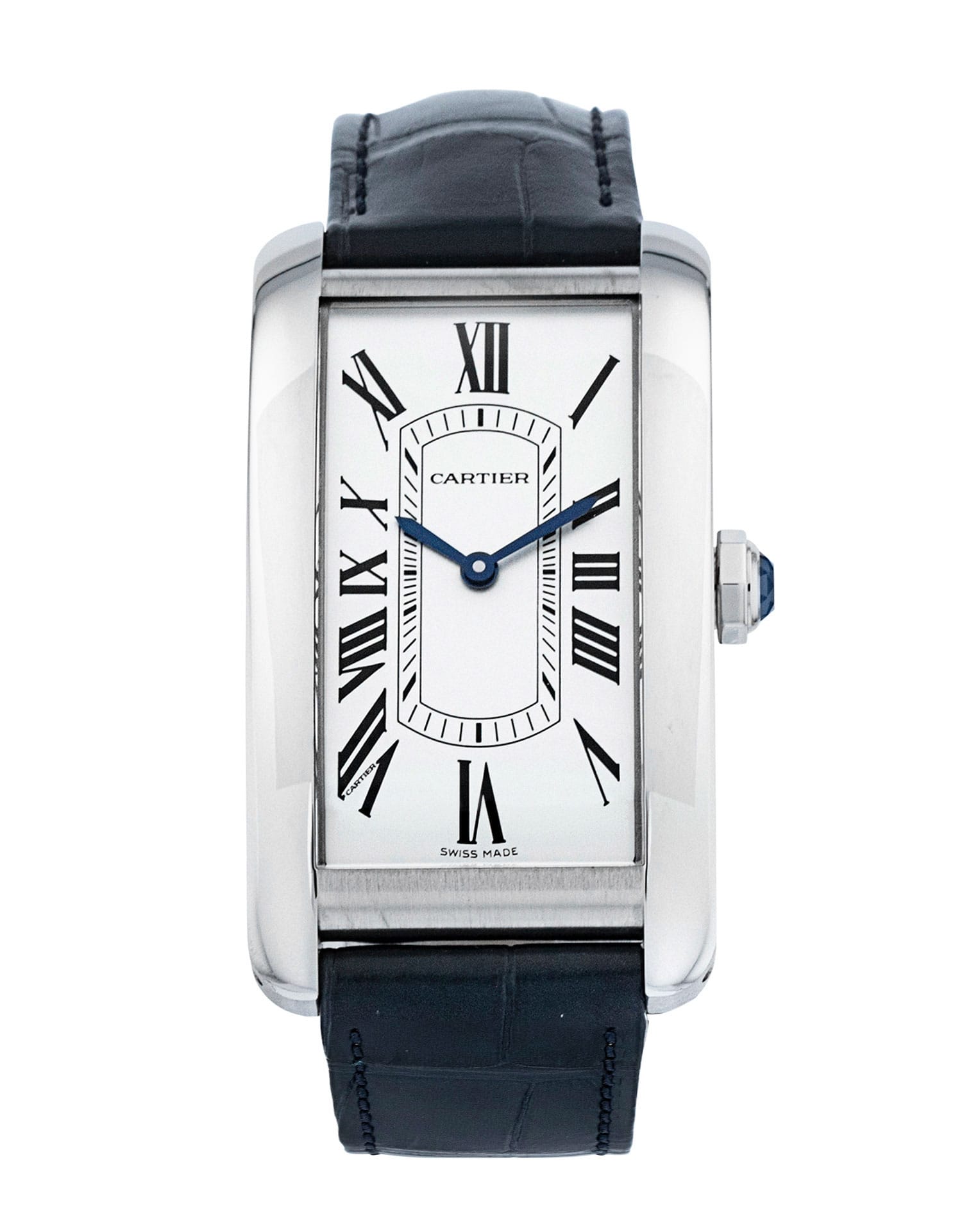 This Cartier Tank Americaine WSTA0083 has a silver roman numeral dial and a leather strap. This Cartier has undergone a thorough inspection of accuracy, functionality and condition at our Cartier certified service centre to determine the level of reconditioning required to meet our strict standards. It has also been checked against our records to ensure authenticity. Our watches have a 24-month warranty for your peace of mind, in conjunction with any remaining manufacturer’s warranty from new or from service.