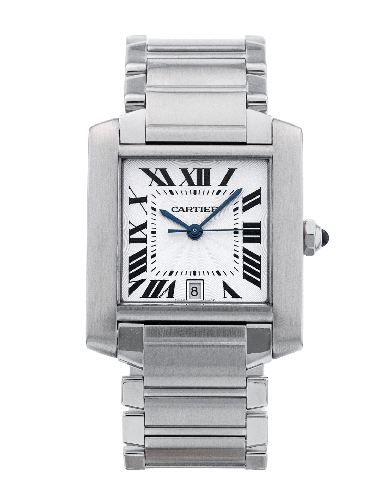 The Cartier Tank, inspired by an actual tank, has been a design milestone since its inception in the early 20th century. Unlike the modified pocket watches being made by other manufacturers, the Tank used a new case design that actually incorporated the lugs into its shape, rather than adding them as an afterthought. Other iconic design elements include the blued sword hands, Roman numerals, elegant square dial and octagonal crown complete with sapphire cabochon. The Française collection adds a somewhat sportier, more modern feel to an already superb timepiece, making it bolder and more versatile, in large part thanks to its chain-link bracelet.
