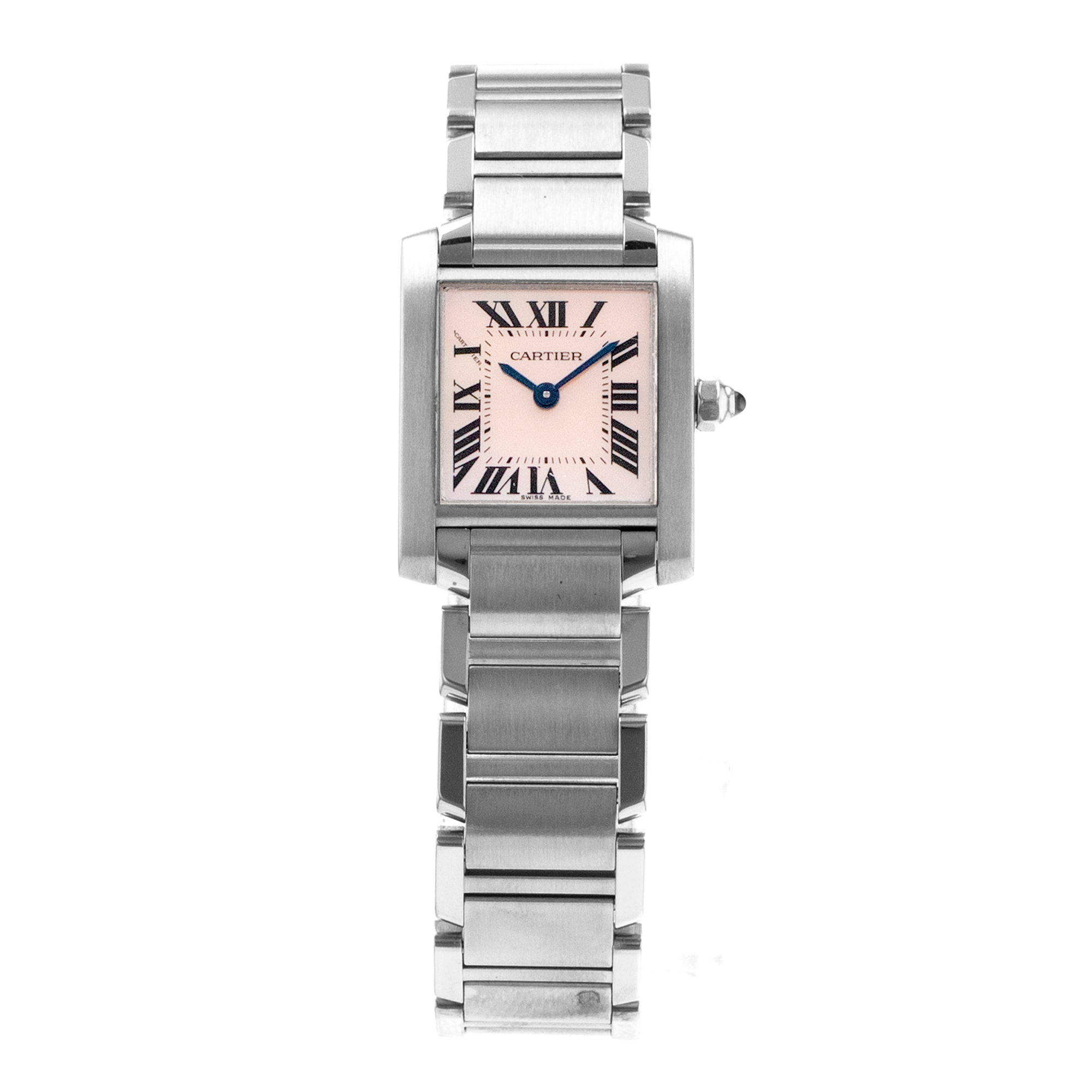 This Cartier Tank Francaise W51028Q3 has a mother of pearl pink roman numeral dial and a bracelet strap. This Cartier has undergone a thorough inspection of accuracy, functionality and condition at our Cartier certified service centre to determine the level of reconditioning required to meet our strict standards. It has also been checked against our records to ensure authenticity. All our watches have a 24-month warranty for your peace of mind.