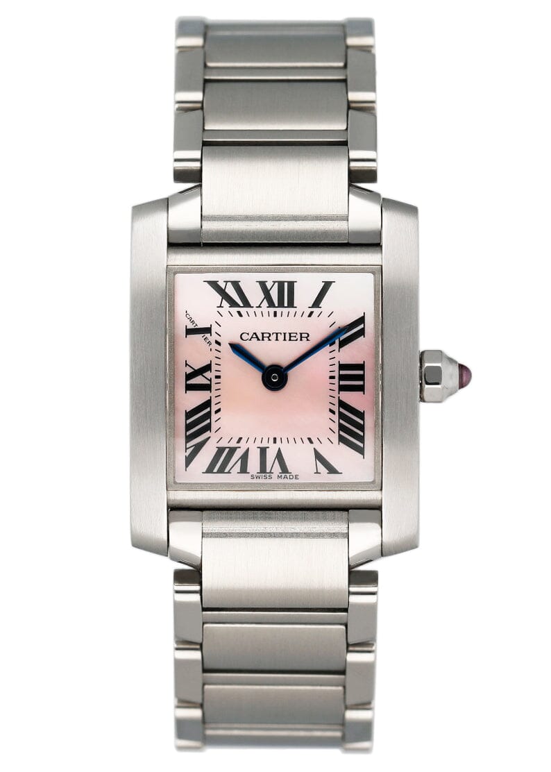 This Cartier Tank Francaise W51028Q3 has a mother of pearl pink roman numeral dial and a bracelet strap. This Cartier has undergone a thorough inspection of accuracy, functionality and condition at our Cartier certified service centre to determine the level of reconditioning required to meet our strict standards. It has also been checked against our records to ensure authenticity. All our watches have a 24-month warranty for your peace of mind.