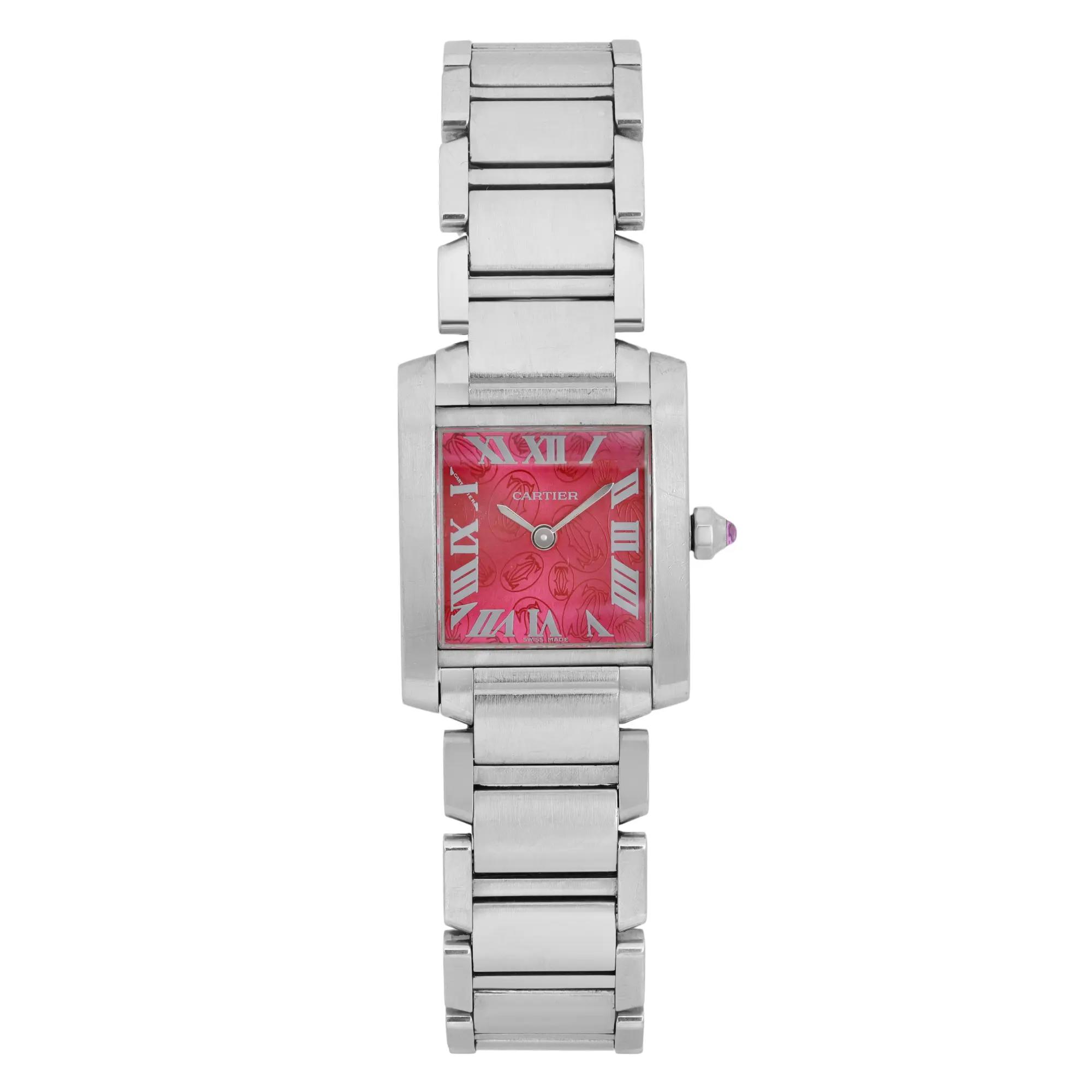 This Cartier Tank Francaise W51030Q3 has a pink roman numeral dial and a bracelet strap. This Cartier has undergone a thorough inspection of accuracy, functionality and condition at our Cartier certified service centre to determine the level of reconditioning required to meet our strict standards. It has also been checked against our records to ensure authenticity. All our watches have a 24-month warranty for your peace of mind.