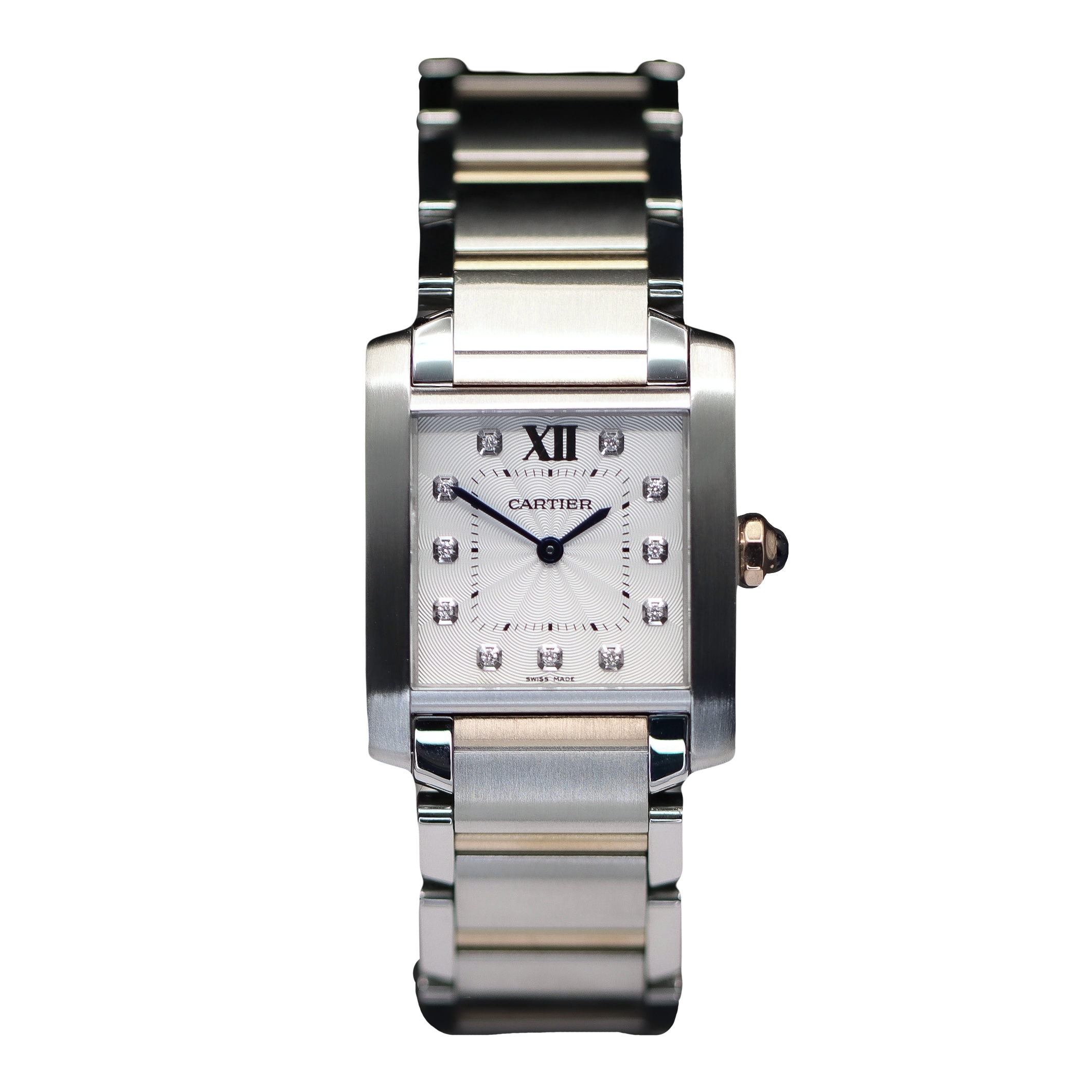 This Cartier Tank Francaise WE110005 has a silver diamond dial and a bracelet strap. This Cartier has undergone a thorough inspection of accuracy, functionality and condition at our Cartier certified service centre to determine the level of reconditioning required to meet our strict standards. It has also been checked against our records to ensure authenticity. All our watches have a 24-month warranty for your peace of mind.