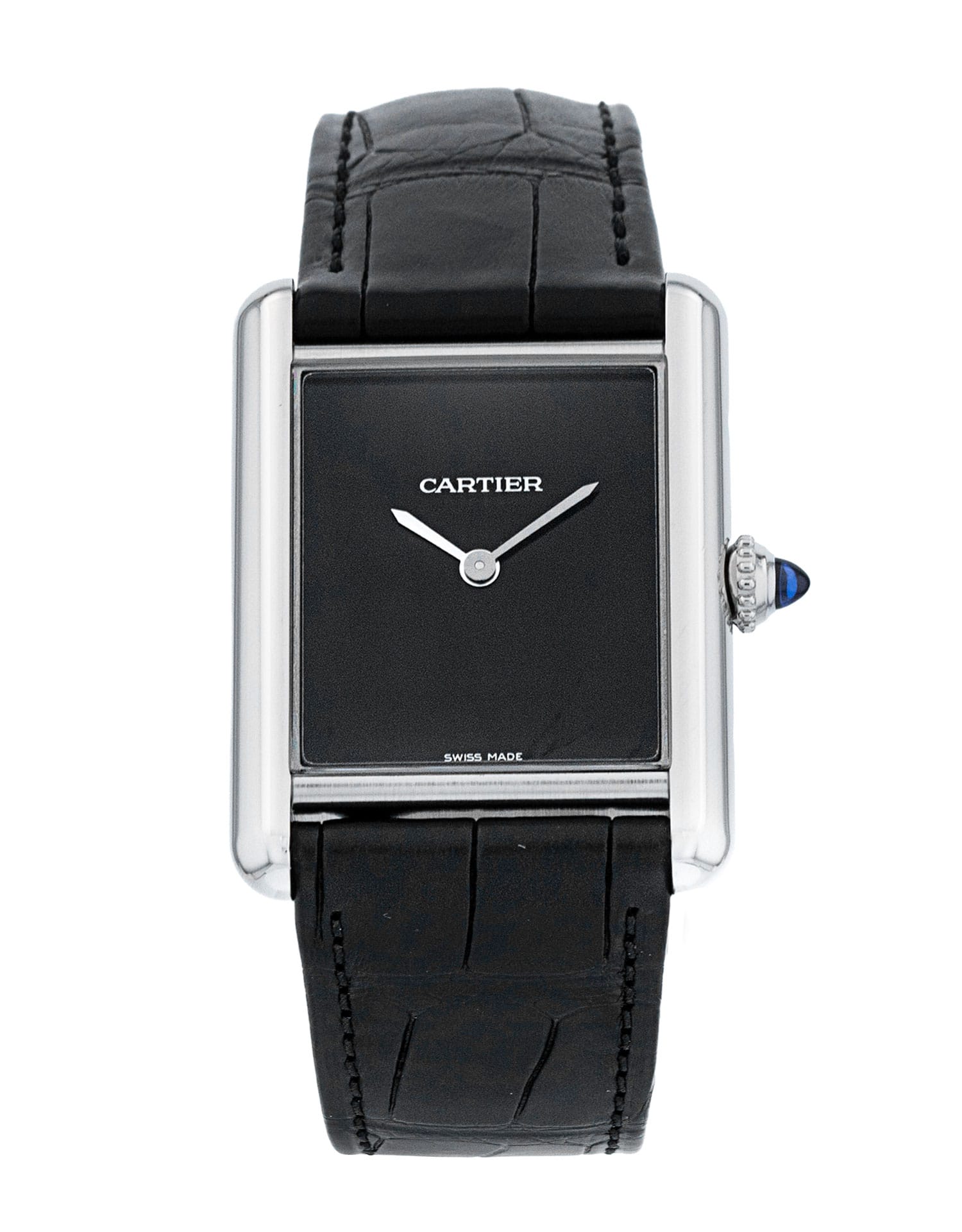 This Cartier Tank Must De Cartier WSTA0072 has a black dial and a leather strap. This Cartier has undergone a thorough inspection of accuracy, functionality and condition at our Cartier certified service centre to determine the level of reconditioning required to meet our strict standards. It has also been checked against our records to ensure authenticity. Our watches have a 24-month warranty for your peace of mind, in conjunction with any remaining manufacturer’s warranty from new or from service.