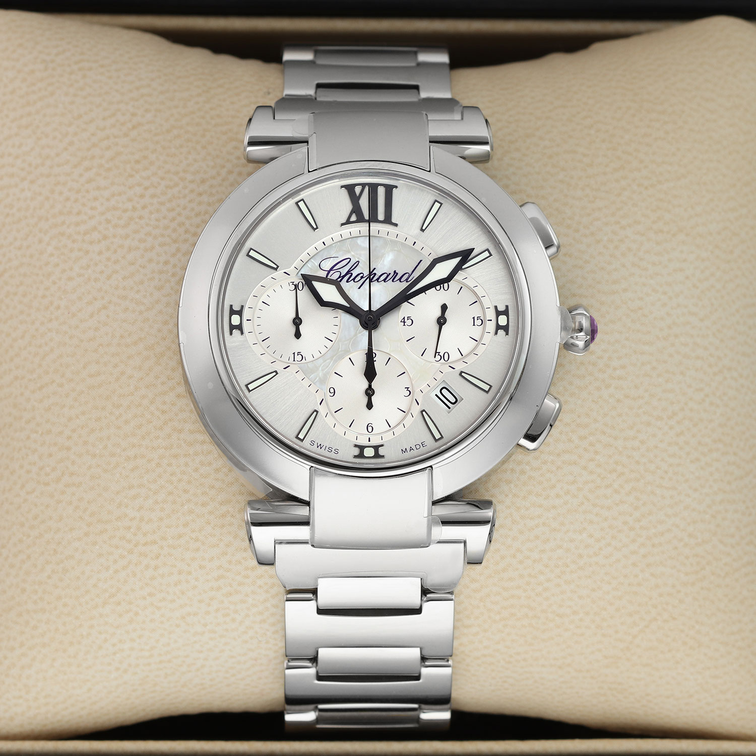 This Chopard Imperiale 388549-3002 has a mother of pearl white dial and a bracelet strap. This Chopard has undergone a thorough inspection of water resistance, accuracy, functionality and condition to determine the level of reconditioning required to meet our strict standards. It has also been referenced against technical documents and manufacturer records where available to ensure authenticity and a clean history. All our watches have a 24-month warranty for your peace of mind.