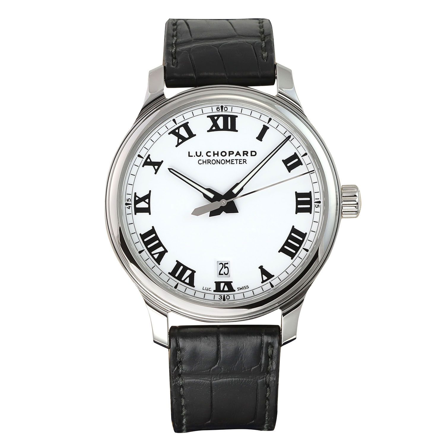 This Chopard LUC 168544-3001 has a white roman numeral dial and a leather strap. This Chopard has undergone a thorough inspection of water resistance, accuracy, functionality and condition to determine the level of reconditioning required to meet our strict standards. It has also been referenced against technical documents and manufacturer records where available to ensure authenticity and a clean history. All our watches have a 24-month warranty for your peace of mind.