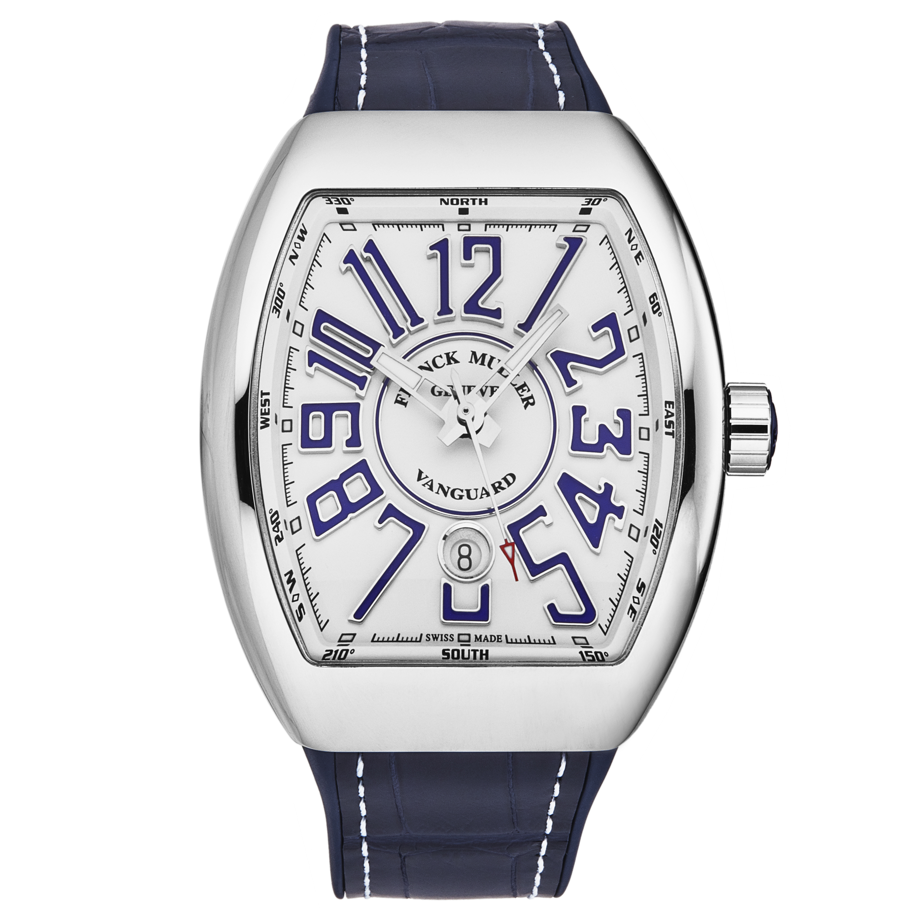 This Franck Muller Vanguard V 45 SC DT BU has a white arabic dial and a leather strap. This Franck Muller has undergone a thorough inspection of water resistance, accuracy, functionality and condition to determine the level of reconditioning required to meet our strict standards. It has also been referenced against technical documents and manufacturer records where available to ensure authenticity and a clean history. All our watches have a 24-month warranty for your peace of mind.