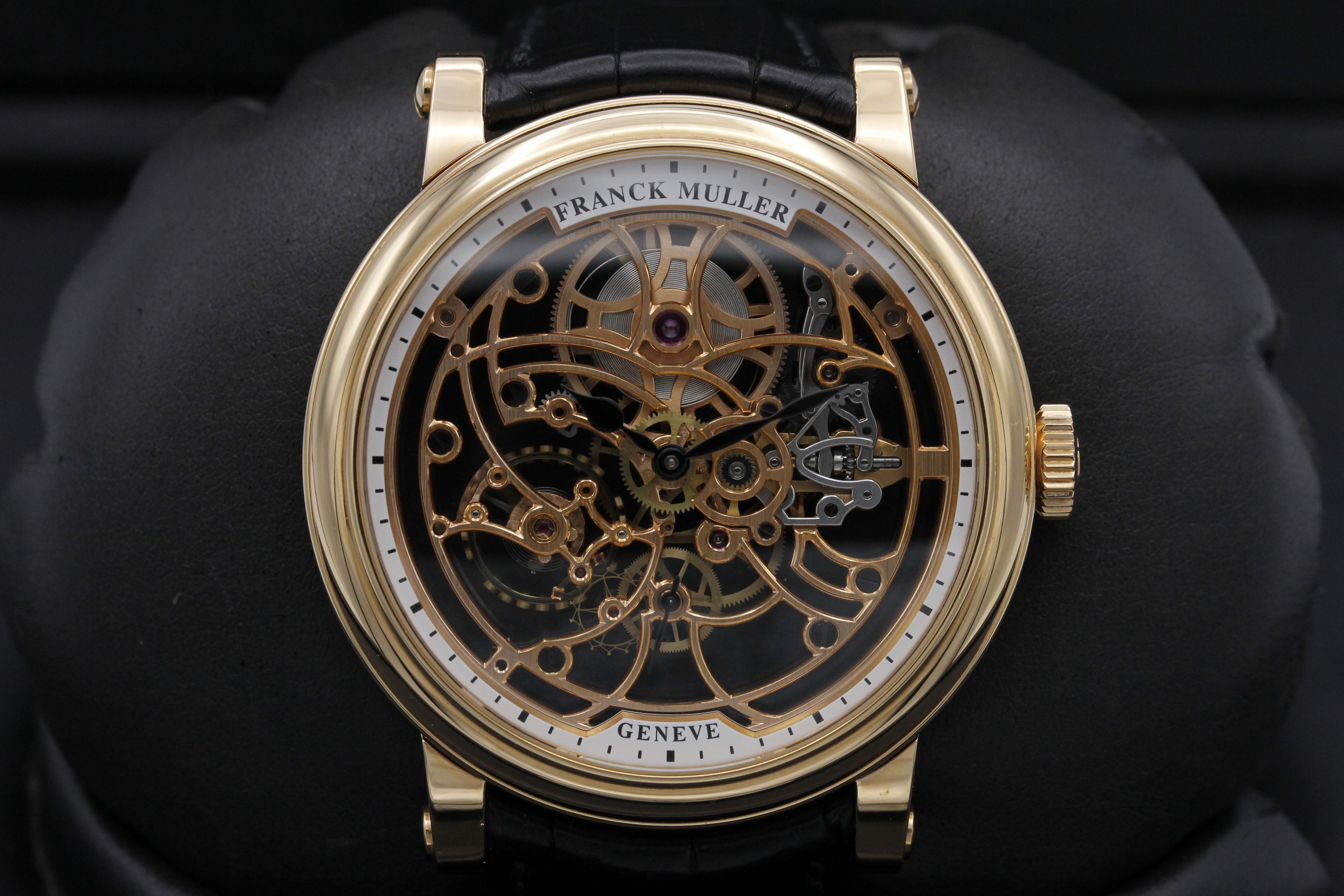 This Franck Muller Power Reserve 7042 B S6 SQT has a skeleton dial and a leather strap. This Franck Muller has undergone a thorough inspection of accuracy, functionality and condition to determine the level of reconditioning required to meet our strict standards. It has also been referenced against technical documents and manufacturer records where available to ensure authenticity and a clean history. All our watches have a 24-month warranty for your peace of mind.