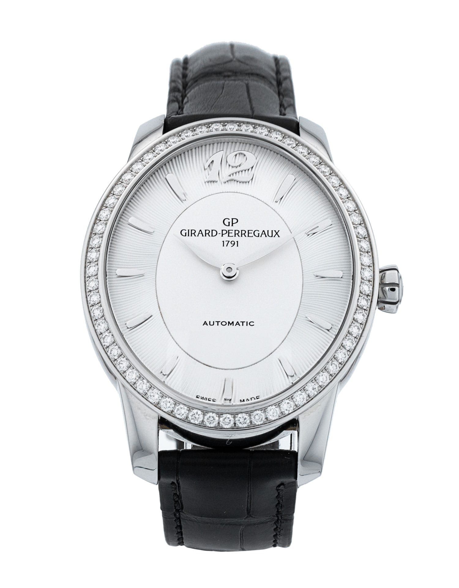 This Girard Perregaux Cat's Eye 80493D11A131-CK6A has a silver dial and a leather strap. This Girard Perregaux has undergone a thorough inspection of water resistance, accuracy, functionality and condition to determine the level of reconditioning required to meet our strict standards. It has also been referenced against technical documents and manufacturer records where available to ensure authenticity and a clean history. All our watches have a 24-month warranty for your peace of mind.