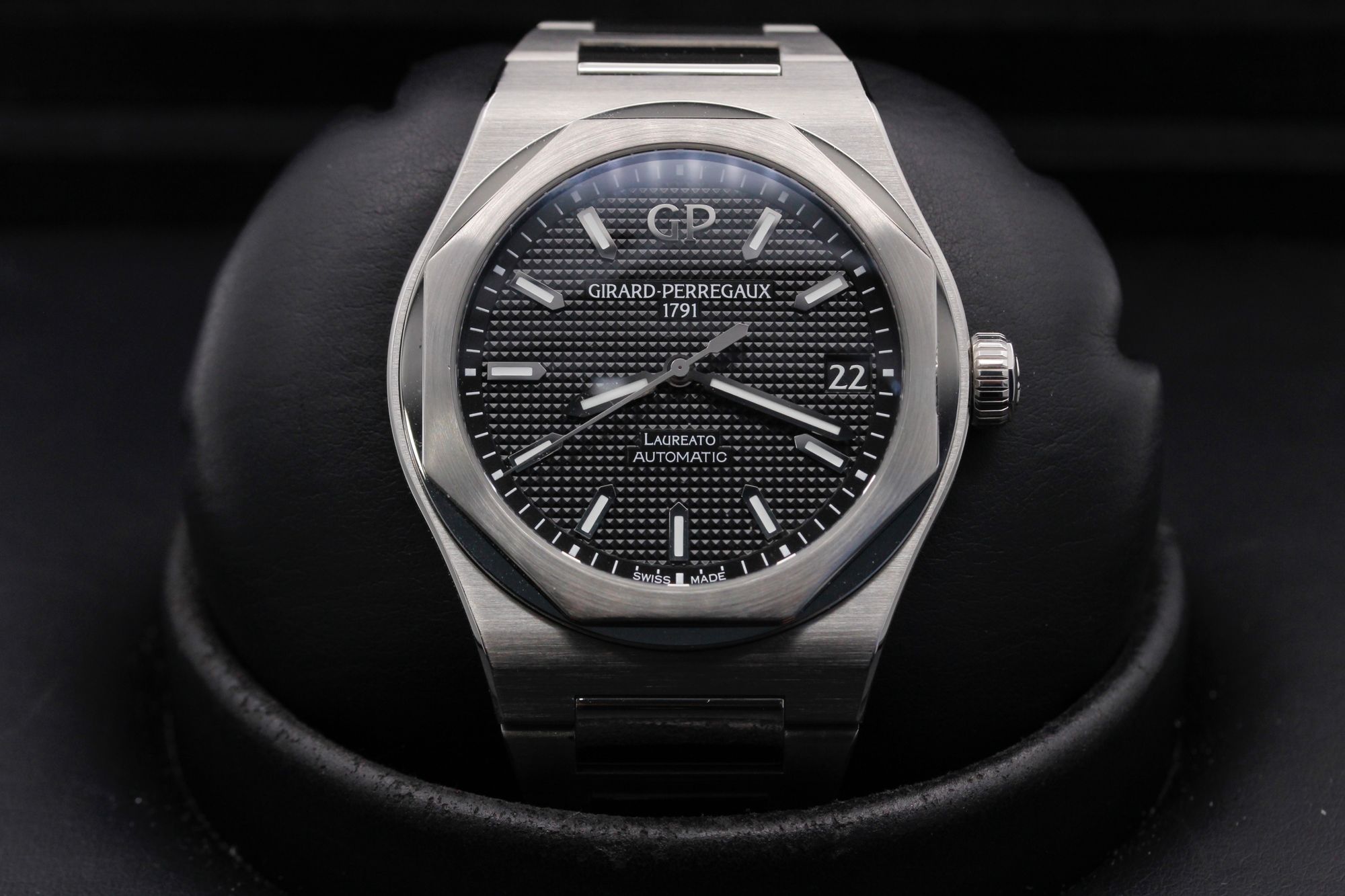 This Girard Perregaux Laureato 81010-11-634-11A has a black baton dial and a bracelet strap. This Girard Perregaux has undergone a thorough inspection of water resistance, accuracy, functionality and condition to determine the level of reconditioning required to meet our strict standards. It has also been referenced against technical documents and manufacturer records where available to ensure authenticity and a clean history. Our watches have a 24-month warranty for your peace of mind, in conjunction with any remaining manufacturer’s warranty from new or from service.