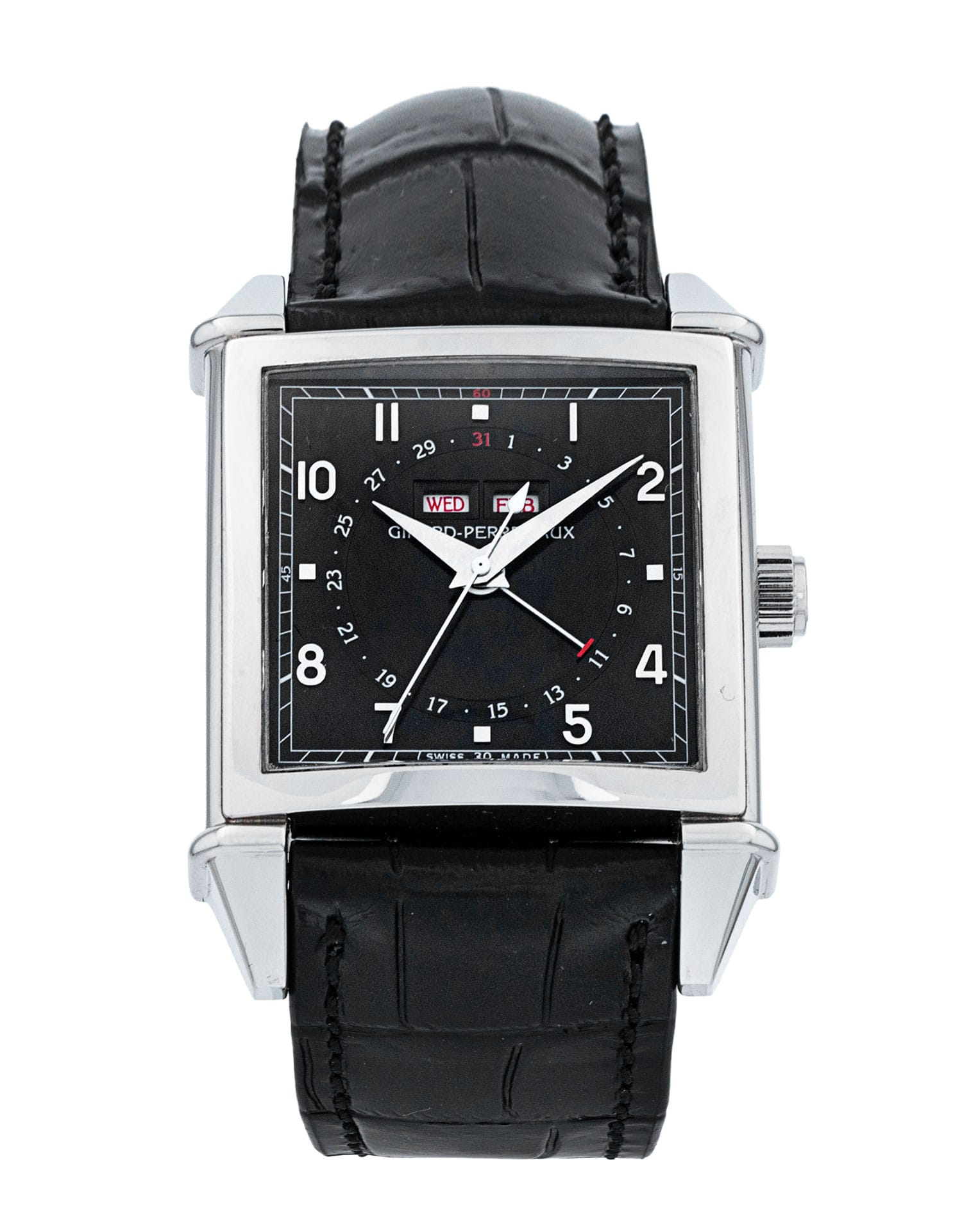 This Girard Perregaux Vintage 1945 GMT 25810-11-651-BA6A has a black arabic dial and a leather strap. This Girard Perregaux has undergone a thorough inspection of accuracy, functionality and condition to determine the level of reconditioning required to meet our strict standards. It has also been referenced against technical documents and manufacturer records where available to ensure authenticity and a clean history. All our watches have a 24-month warranty for your peace of mind.