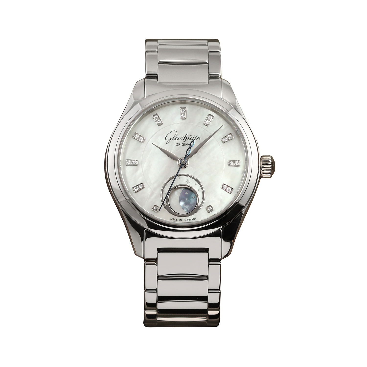 This Glashutte Original Lady Serenade 1-35-14-02-02-14 has a mother of pearl white - diamond dial and a bracelet strap. This Glashutte Original has undergone a thorough inspection of water resistance, accuracy, functionality and condition to determine the level of reconditioning required to meet our strict standards. It has also been referenced against technical documents and manufacturer records where available to ensure authenticity and a clean history. Our watches have a 24-month warranty for your peace of mind, in conjunction with any remaining manufacturer’s warranty from new or from service.