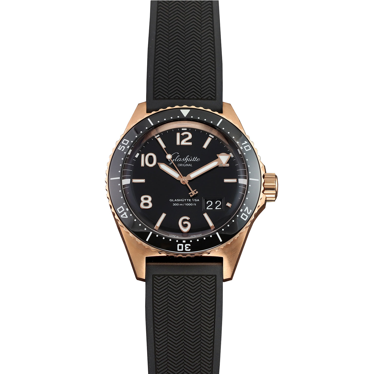 This Glashutte Original SeaQ Panorama Date 1-36-13-03-90-34 has a black arabic dial and a rubber strap. This Glashutte Original has undergone a thorough inspection of water resistance, accuracy, functionality and condition to determine the level of reconditioning required to meet our strict standards. It has also been referenced against technical documents and manufacturer records where available to ensure authenticity and a clean history. Our watches have a 24-month warranty for your peace of mind, in conjunction with any remaining manufacturer’s warranty from new or from service.