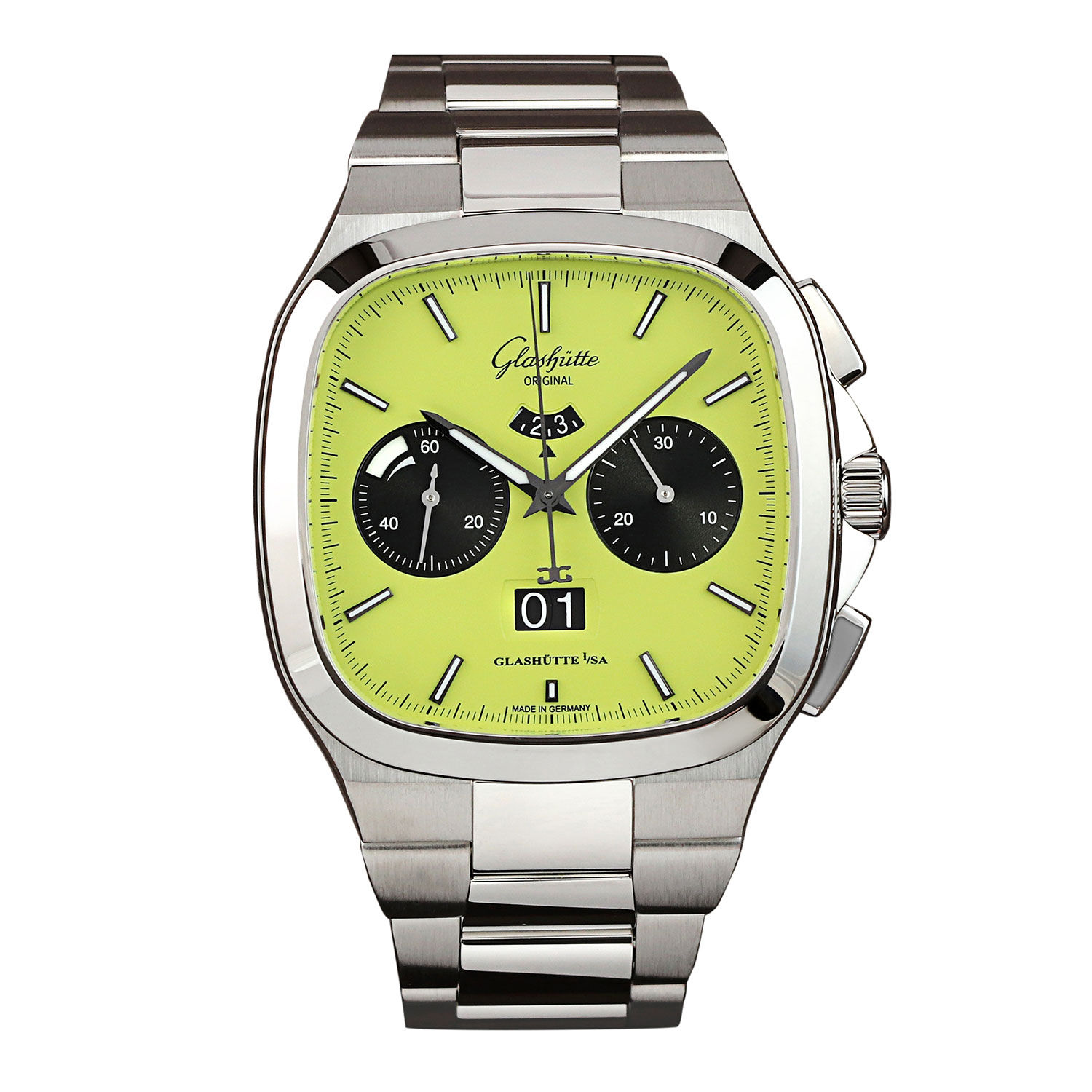 This Glashutte Original Seventies Panorama Date 1-37-02-19-02-70 has a green dial and a bracelet strap. This Glashutte Original has undergone a thorough inspection of water resistance, accuracy, functionality and condition to determine the level of reconditioning required to meet our strict standards. It has also been referenced against technical documents and manufacturer records where available to ensure authenticity and a clean history. Our watches have a 24-month warranty for your peace of mind, in conjunction with any remaining manufacturer’s warranty from new or from service.