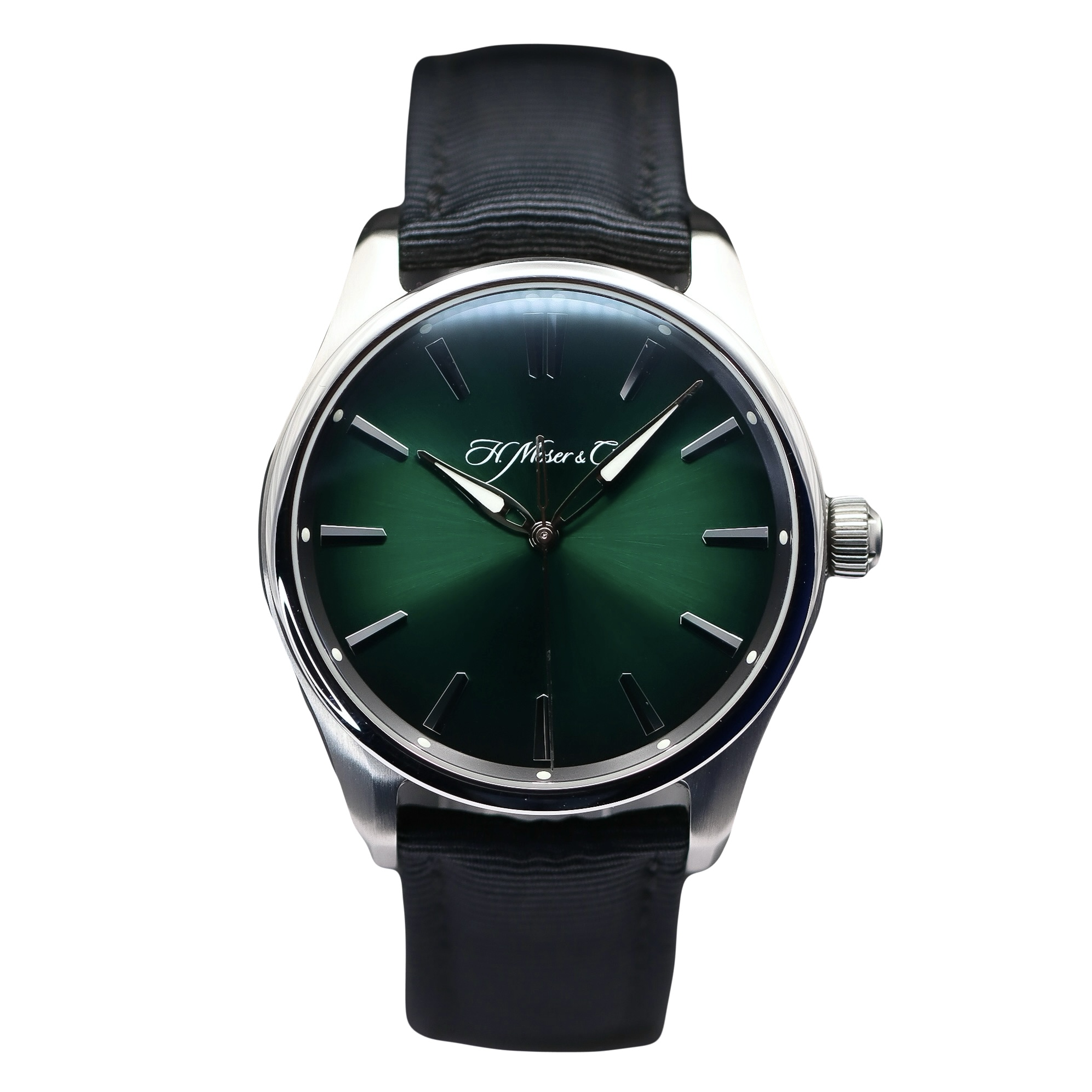 This H. Moser and Cie Pioneer 3200-1202 has a green baton dial and a rubber strap. This H. Moser and Cie has undergone a thorough inspection of water resistance, accuracy, functionality and condition to determine the level of reconditioning required to meet our strict standards. It has also been referenced against technical documents and manufacturer records where available to ensure authenticity and a clean history. All our watches have a 24-month warranty for your peace of mind.