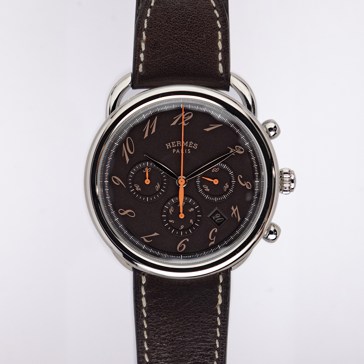 This Hermes Arceau AR4.910 has a chocolate arabic dial and a leather strap. This Hermes has undergone a thorough inspection of water resistance, accuracy, functionality and condition to determine the level of reconditioning required to meet our strict standards. It has also been referenced against technical documents and manufacturer records where available to ensure authenticity and a clean history. All our watches have a 24-month warranty for your peace of mind.