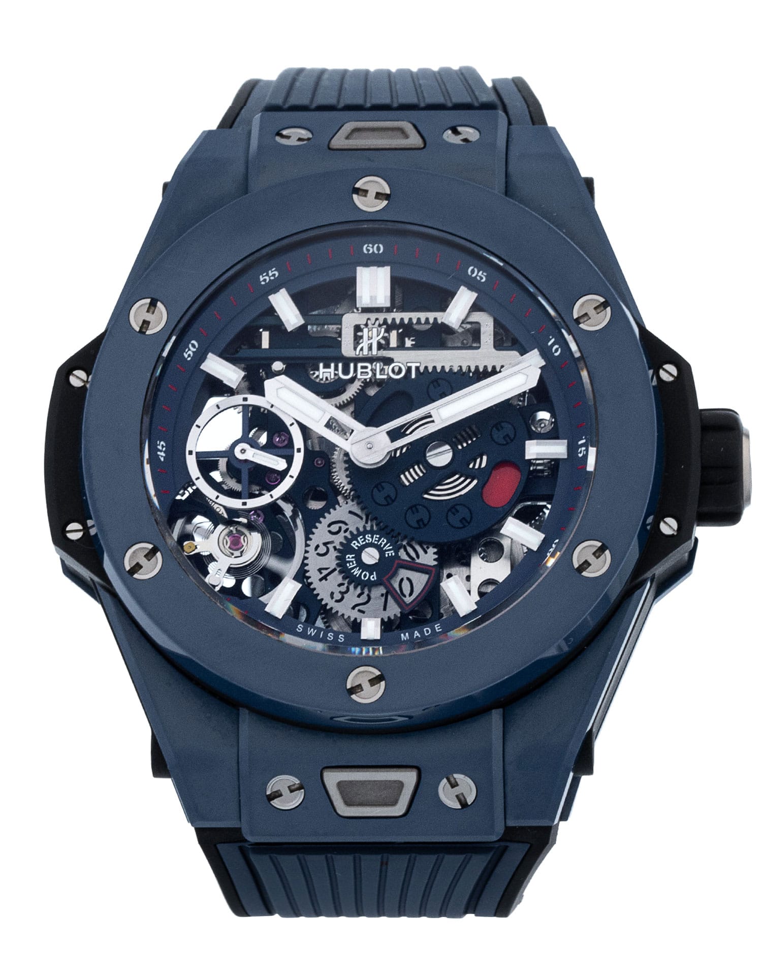 This Hublot Big Bang 414.EX.5123.RX has a skeleton blue dial dial and a rubber strap. This Hublot has undergone a thorough inspection of water resistance, accuracy, functionality and condition to determine the level of reconditioning required to meet our strict standards. It has also been referenced against technical documents and manufacturer records where available to ensure authenticity and a clean history. All our watches have a 24-month warranty for your peace of mind.