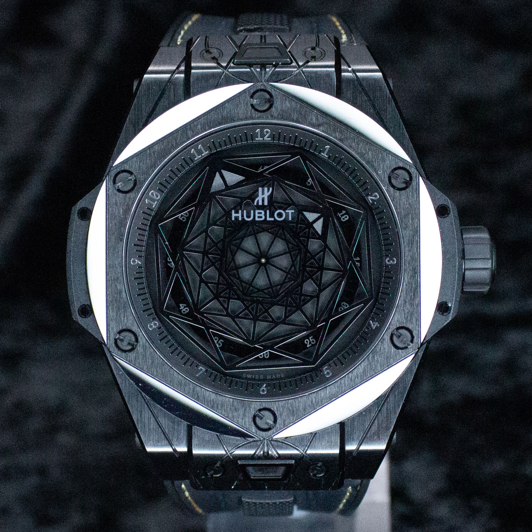 This Hublot Big Bang 415.CX.1114.VR.MXM17 has a black dial and a leather strap. This Hublot has undergone a thorough inspection of water resistance, accuracy, functionality and condition to determine the level of reconditioning required to meet our strict standards. It has also been referenced against technical documents and manufacturer records where available to ensure authenticity and a clean history. All our watches have a 24-month warranty for your peace of mind.