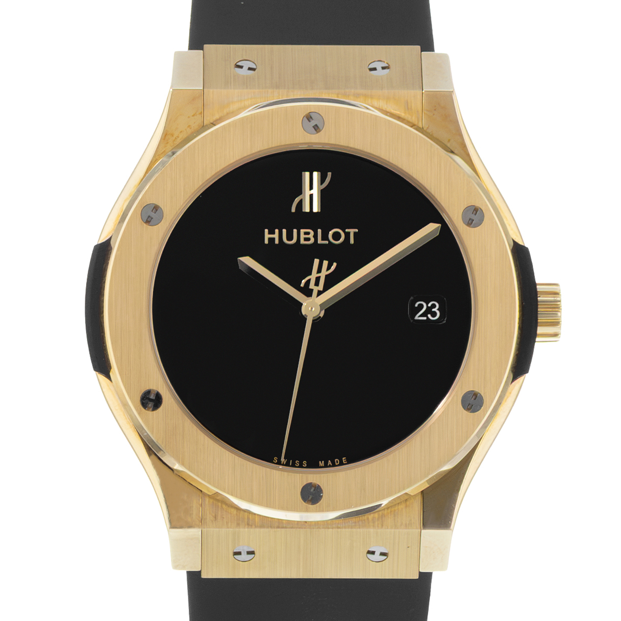 This Hublot Classic Fusion 511.VX.1280.RX.MDM40 has a black dial and a rubber strap. This Hublot has undergone a thorough inspection of water resistance, accuracy, functionality and condition to determine the level of reconditioning required to meet our strict standards. It has also been referenced against technical documents and manufacturer records where available to ensure authenticity and a clean history. All our watches have a 24-month warranty for your peace of mind.