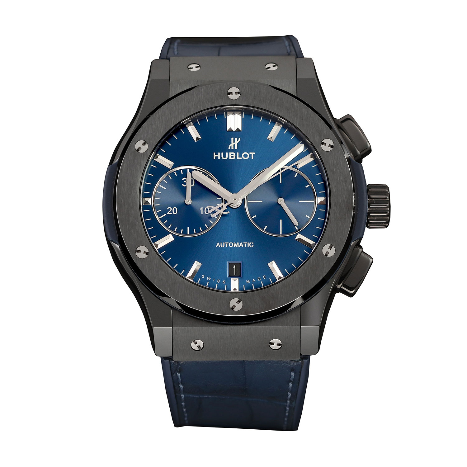 This Hublot Classic Fusion 521.CM.7170.LR has a blue baton dial and a leather strap. This Hublot has undergone a thorough inspection of water resistance, accuracy, functionality and condition to determine the level of reconditioning required to meet our strict standards. It has also been referenced against technical documents and manufacturer records where available to ensure authenticity and a clean history. All our watches have a 24-month warranty for your peace of mind.