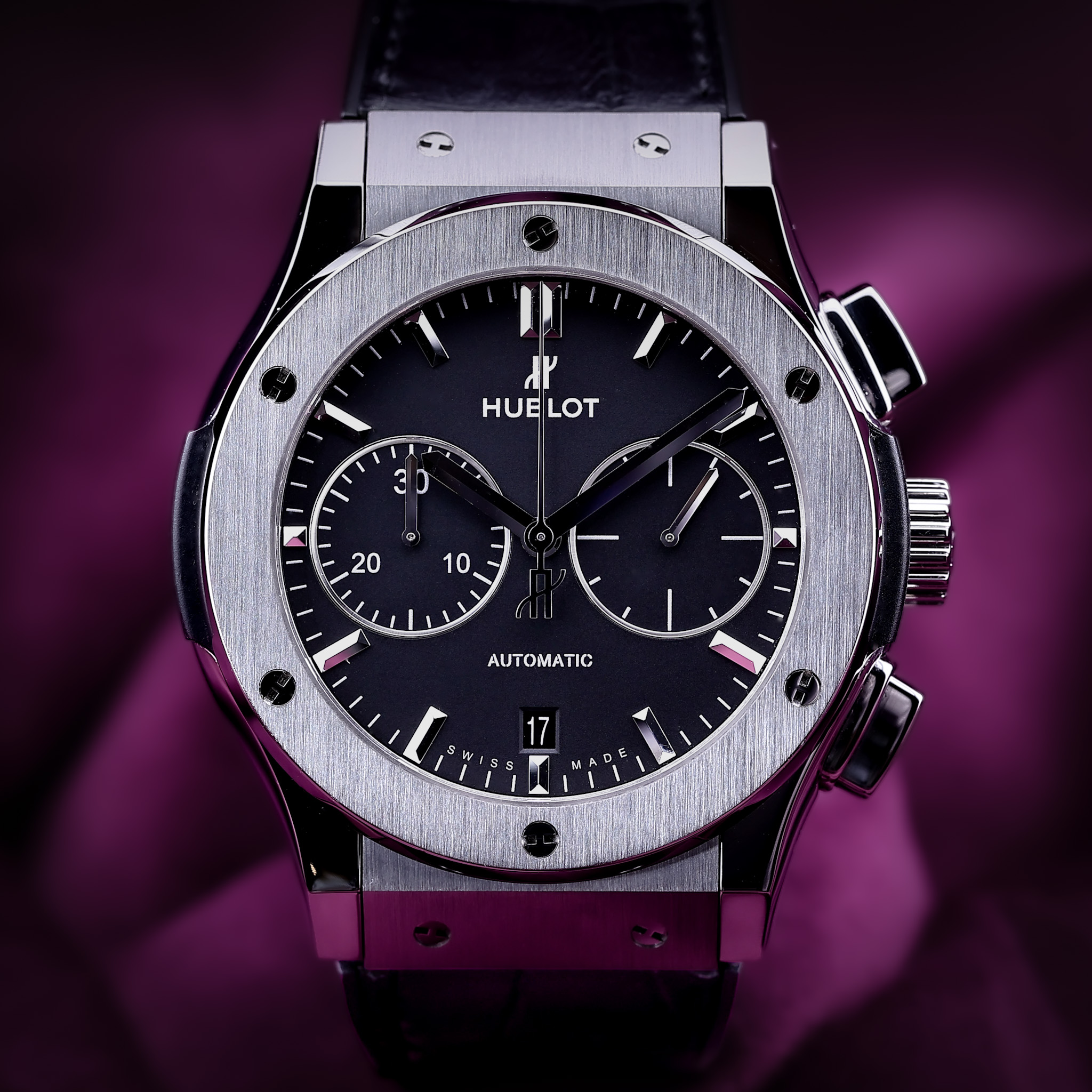 This Hublot Classic Fusion 521.NX.1171.LR has a black baton dial and a leather strap. This Hublot has undergone a thorough inspection of water resistance, accuracy, functionality and condition to determine the level of reconditioning required to meet our strict standards. It has also been referenced against technical documents and manufacturer records where available to ensure authenticity and a clean history. All our watches have a 24-month warranty for your peace of mind.