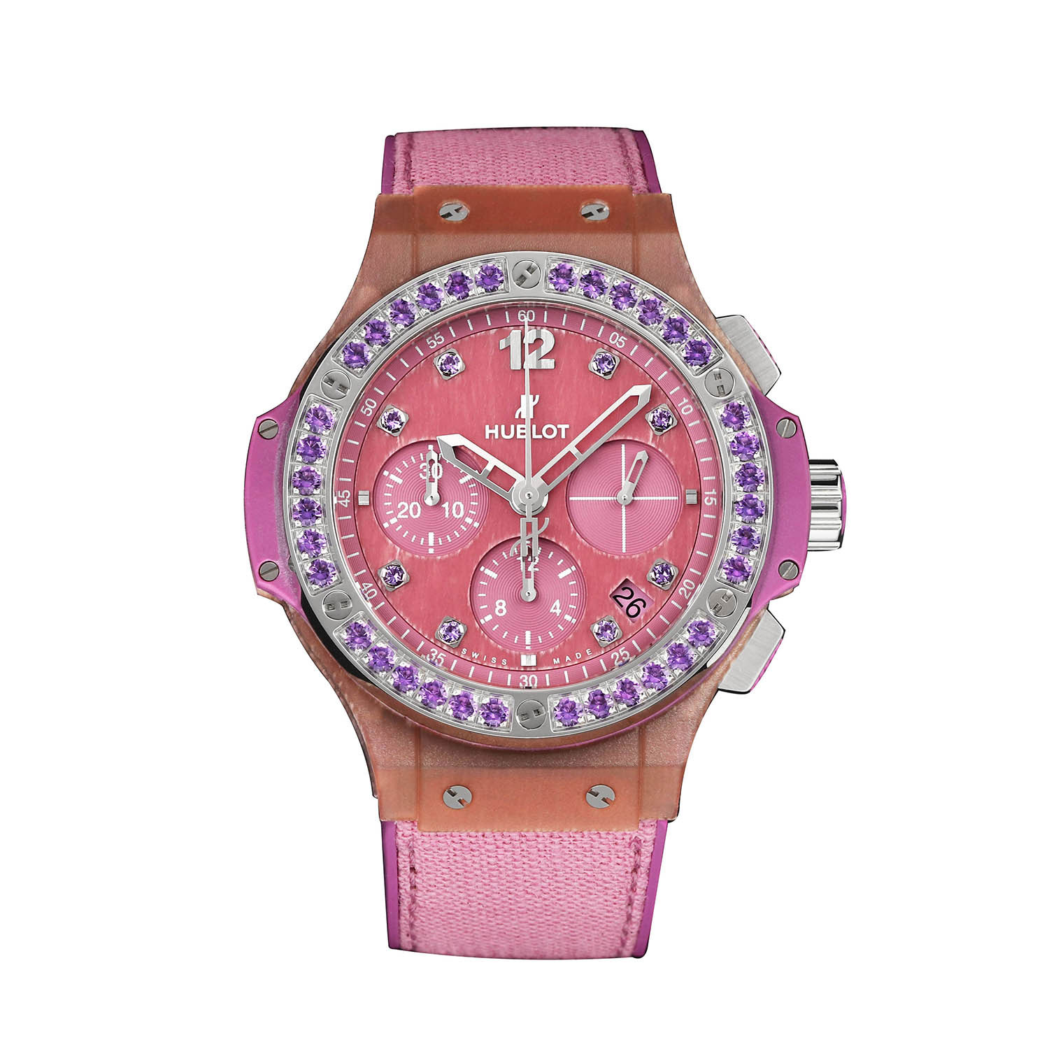This Hublot Tutti Frutti 341.XP.2770.NR.1205 has a pink diamond dial and a fabric strap. This Hublot has undergone a thorough inspection of water resistance, accuracy, functionality and condition to determine the level of reconditioning required to meet our strict standards. It has also been referenced against technical documents and manufacturer records where available to ensure authenticity and a clean history. All our watches have a 24-month warranty for your peace of mind.