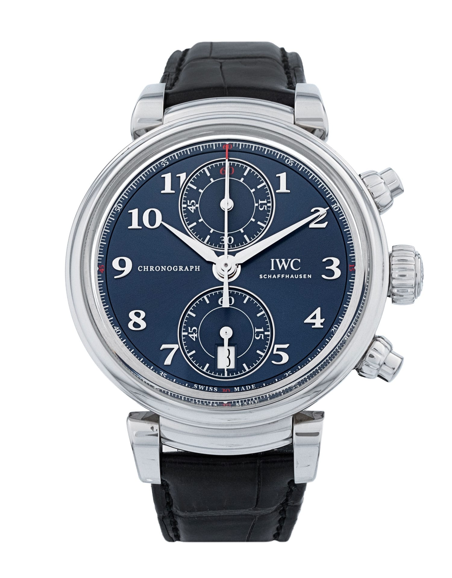 This IWC Da Vinci Chronograph IW393402 has a blue arabic dial and a leather strap. This IWC has undergone a thorough inspection of accuracy, functionality and condition at our IWC certified service centre to determine the level of reconditioning required to meet our strict standards. It has also been checked against our records to ensure authenticity. All our watches have a 24-month warranty for your peace of mind.