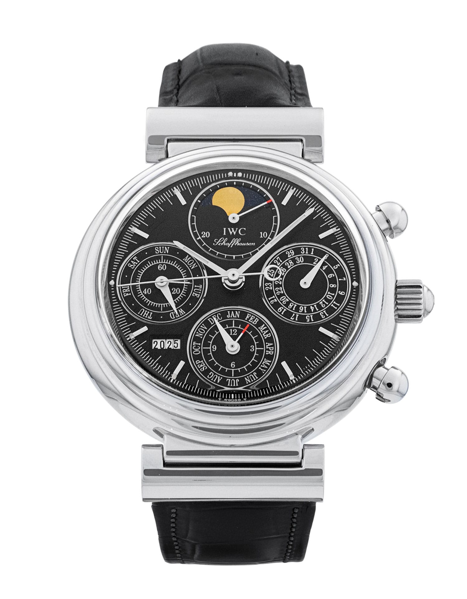 This IWC Da Vinci Perpetual Calendar IW375030 has a black baton dial and a leather strap. This IWC has undergone a thorough inspection of accuracy, functionality and condition at our IWC certified service centre to determine the level of reconditioning required to meet our strict standards. It has also been checked against our records to ensure authenticity. All our watches have a 24-month warranty for your peace of mind.
