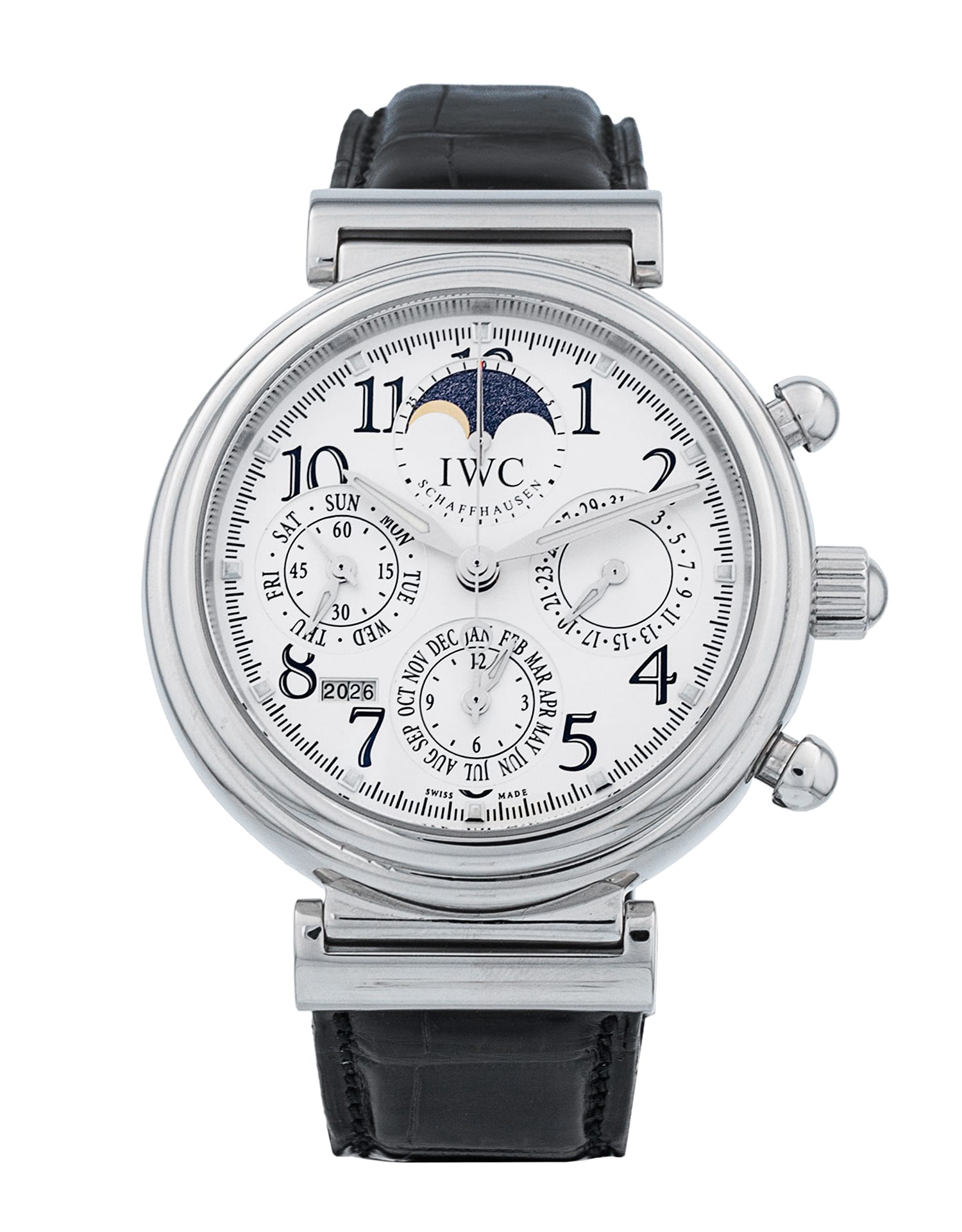 This IWC Da Vinci Perpetual Calendar IW375803 has a silver arabic dial and a leather strap. This IWC has undergone a thorough inspection of accuracy, functionality and condition at our IWC certified service centre to determine the level of reconditioning required to meet our strict standards. It has also been checked against our records to ensure authenticity. All our watches have a 24-month warranty for your peace of mind.